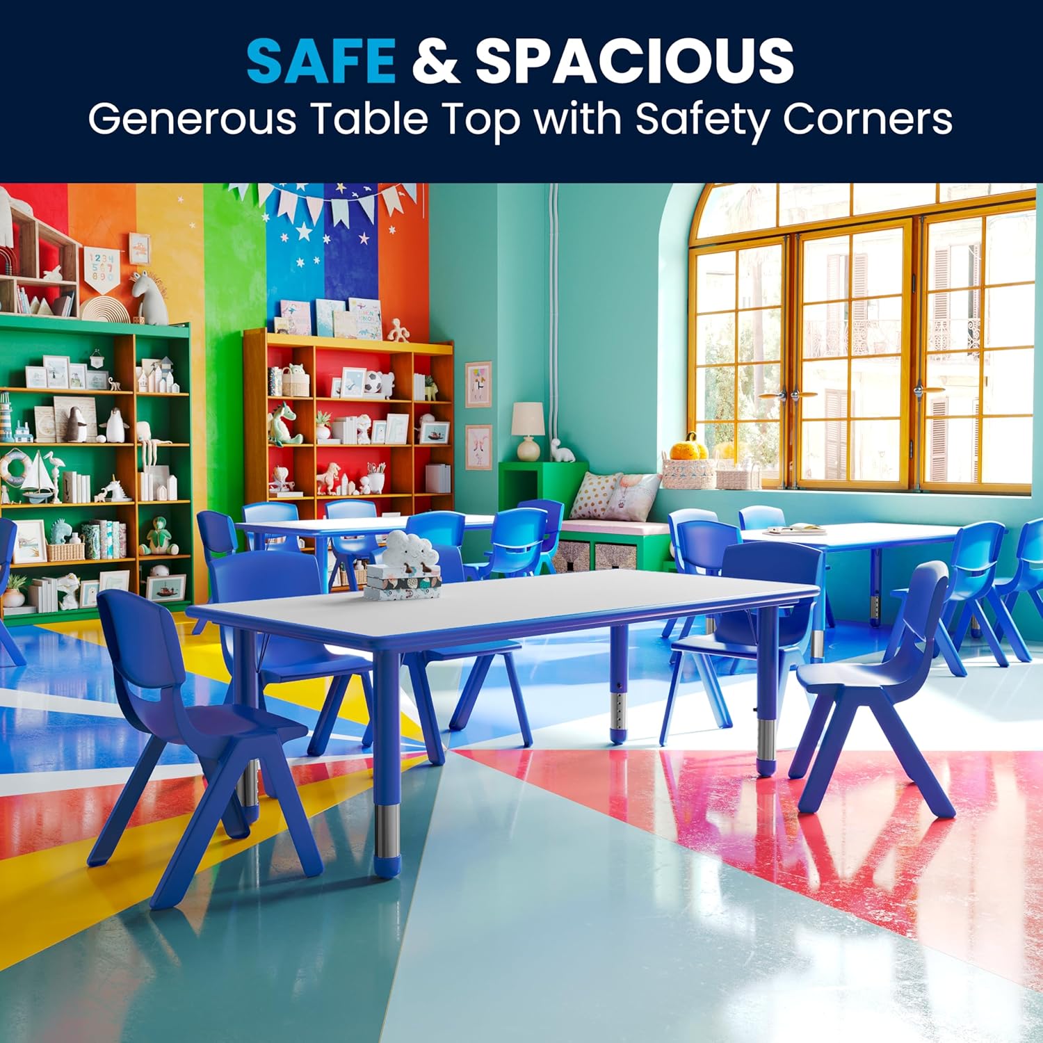 • SEATS UP TO 6 CHILDREN: Comfortably seats up to 6 children with plenty of room between each child and can be paired with 6 vibrant stackable school chairs with a height size of 6.5" to 14"