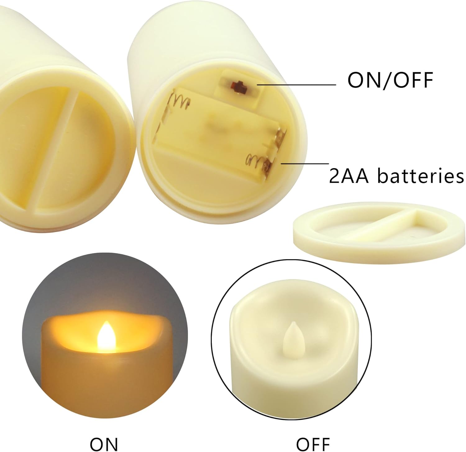 - Looks and flickers like a real candle, and safe to use with. With flickering LED bulb and realistic appearance, the plastic resin battery candle looks like and flickers like a real candle. Battery operated LED flameless candle is safe to use with, especially when you have children, seniors and pets at home. There is no fire hazard, no fume and no wax mess.