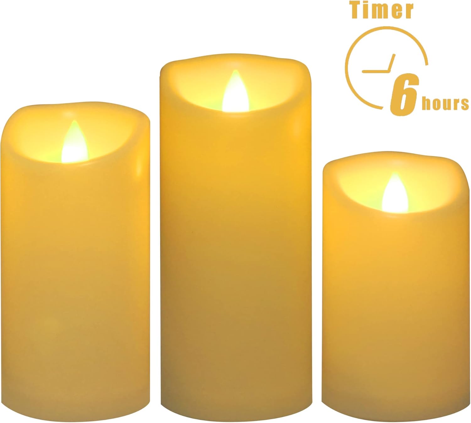 - Easy to use with timer. There is a built-in timer inside each battery LED candle. Once the pillar candle is turned on, the timer starts to work. The LED flameless candle stays on for 6 hours and turns off automatically for the next 18 hour. This 6-hour on, 18-hour off cycle repeats every day. The daily cycle timer saves the troubles of turning on and off this flameless LED candle light manually.