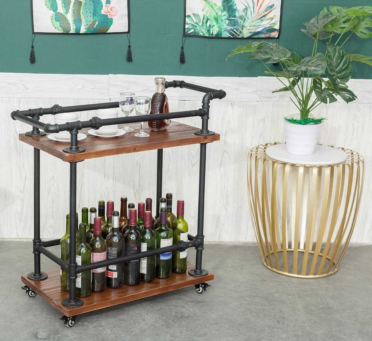 Industrial Pipe Bar Carts/Serving Carts/Kitchen Carts/Wine Rack Carts on Wheels with Shelves - Wood Rolling Carts - Wine Tea Liquor Shelves/Holder - Home Furniture