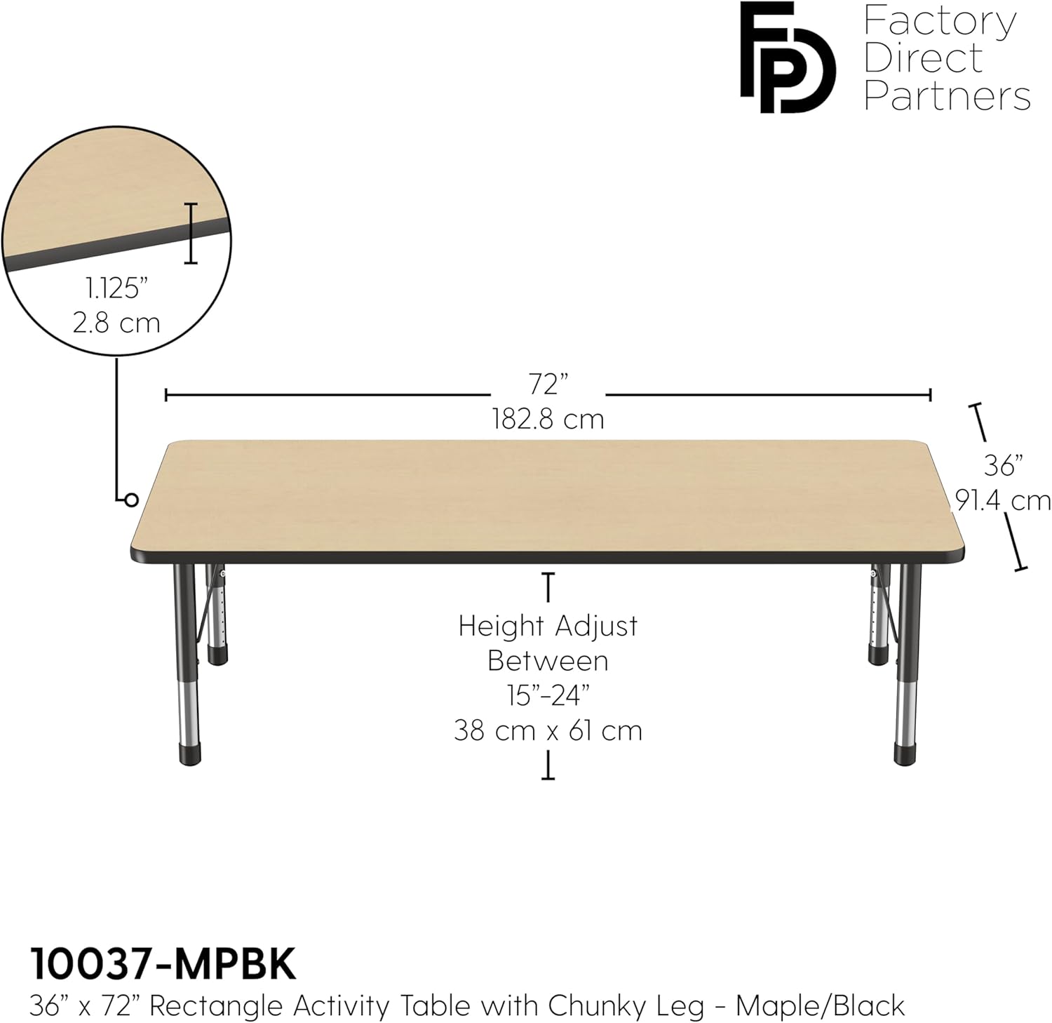 FDP Rectangle Activity School and Classroom Kids Table (36 x 72 inch), Toddler Legs, Adjustable Height 15-24 inches - Maple Top and Black Edge