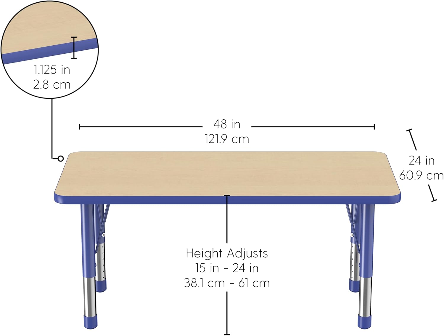 FDP Rectangle Activity School and Kids Classroom Table (24 x 48 inch), Toddler Legs, Adjustable Height 15-24 inches - Maple Top and Blue Edge