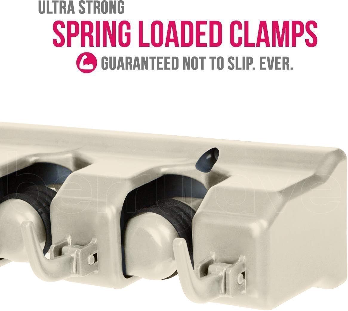 - NO SLIDE, NO MESS β Each commercial grade broom hanger has a 35 pound holding capacity. Thanks to the spring loaded, double rubber gripped slots, the Berry Ave utility hooks can hold anything from wet mops and dirty rakes to baseball bats, without any annoying slipping.