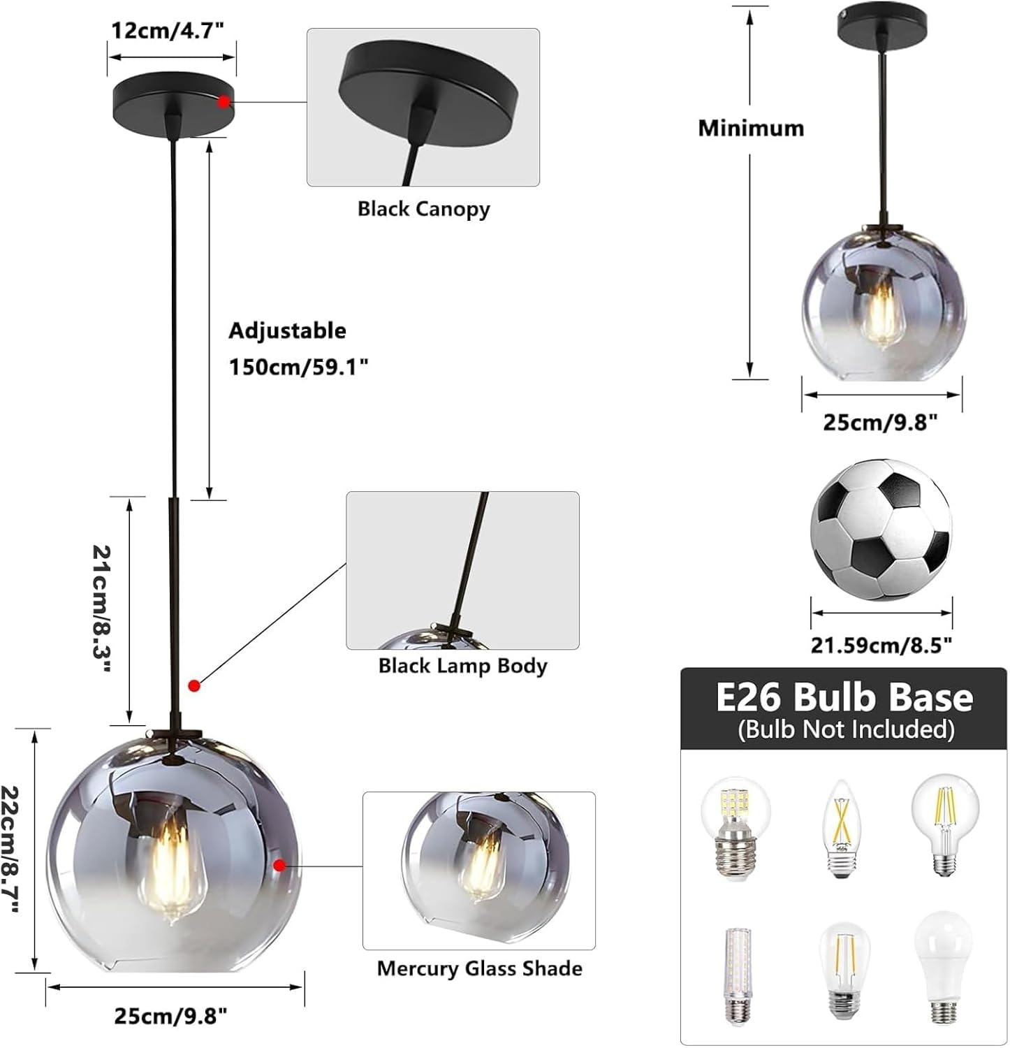 - Black Glass Pendant Light Size: The mercury glass ceiling light globe diameter: 9.8โ(25cm), canopy: 4.7โ(12cm). Light source: E26 (Bulb not included)(bulb replacement ASIN: B081WVNCVM), voltage: 110-220V for worldwide. The glass globe pendant light can be dimmable when work with dimmable bulb and switch