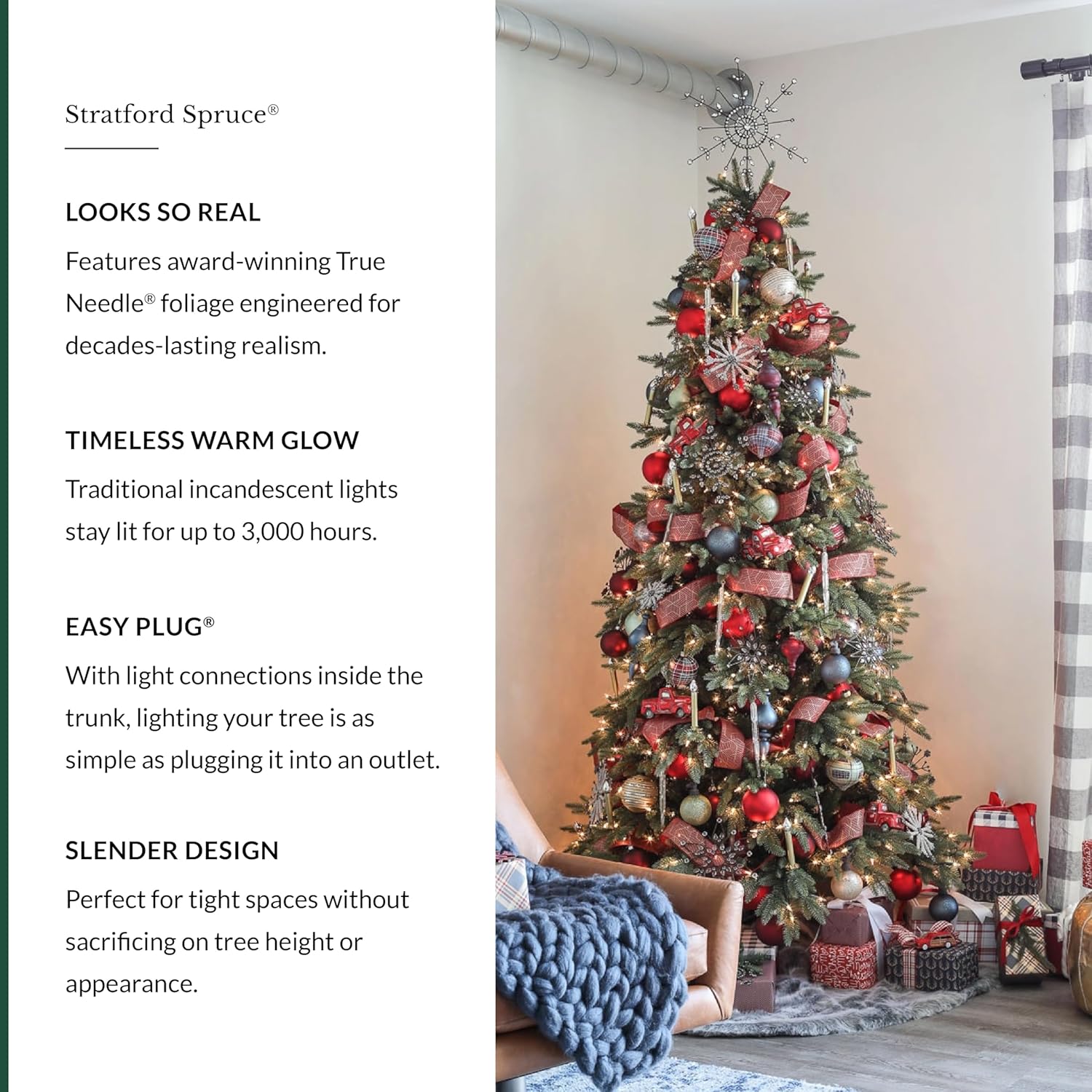 - Ultra-Realistic Stratford Spruce Design: This 9 foot slim artificial christmas tree features award-winning True Needle foliage with 4,414+ tree branch tips and 1,000 professional christmas lights, delivering exceptional value through lifelike appearance that surpasses fake tree alternatives for decades of sophisticated holiday decor