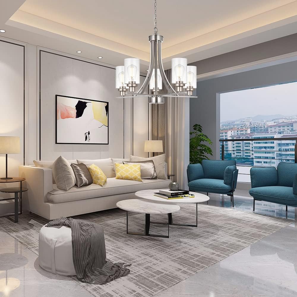- ๐ Adjustable : Chandelier: 20" (H) x 22.5" (D). Clear Glass Shades: 6" (H) x 4" (D).Canopy: 5.11" (D) , includes 57" of adjustable chain,you can adjust the hanging height as per your request.