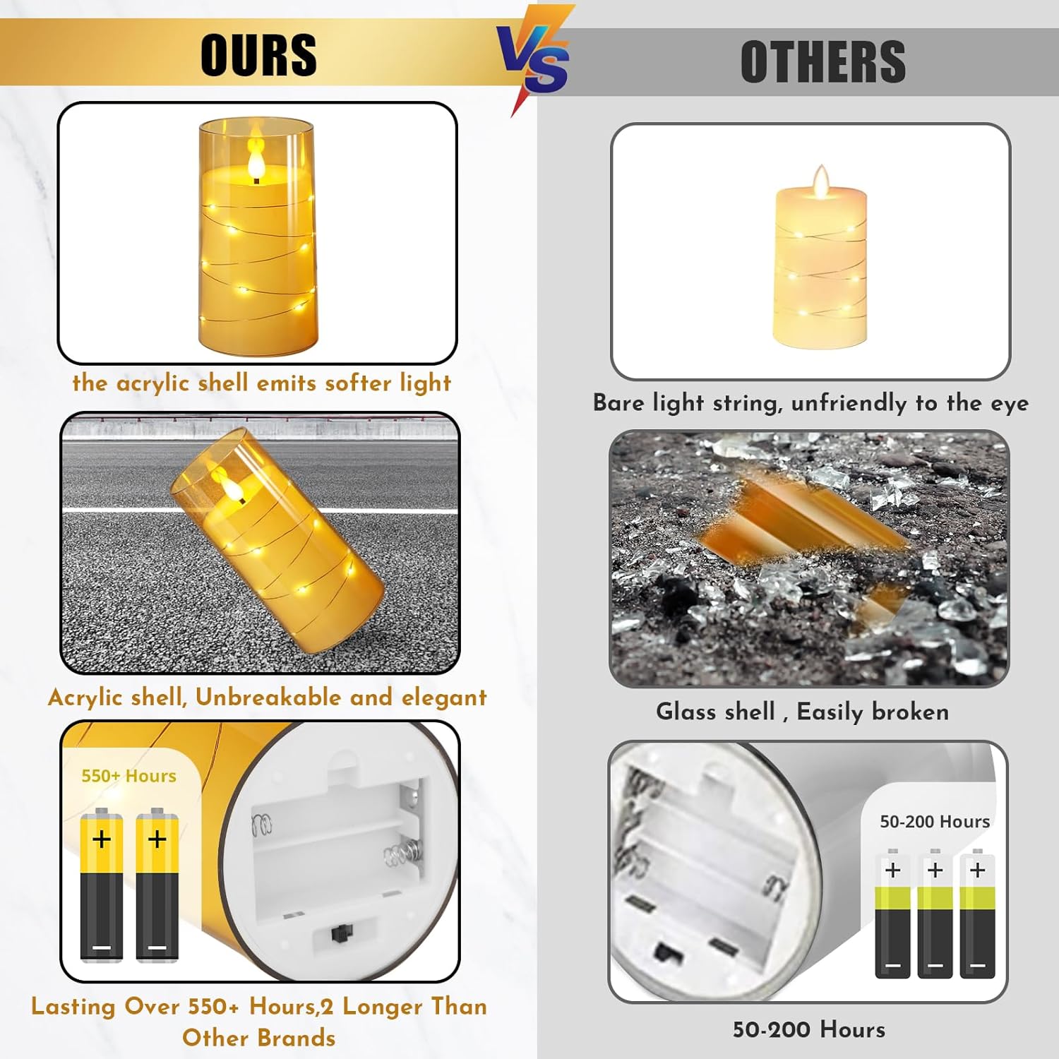 - Creative Embedded Starlight String Technology - Silver metal wire strung 16 warm little stars, winding around the middle flameless candle, this unique designed acrylic shell makes the LED pillar candle light shine softer and not dazzling. While the candle bright, the string of 12 to 16 LEDs are also lit. Placed on your bedside or dinner table, the extreme warm and romantic candlelight and starlight are full of classical and noble atmosphere, real and beauty