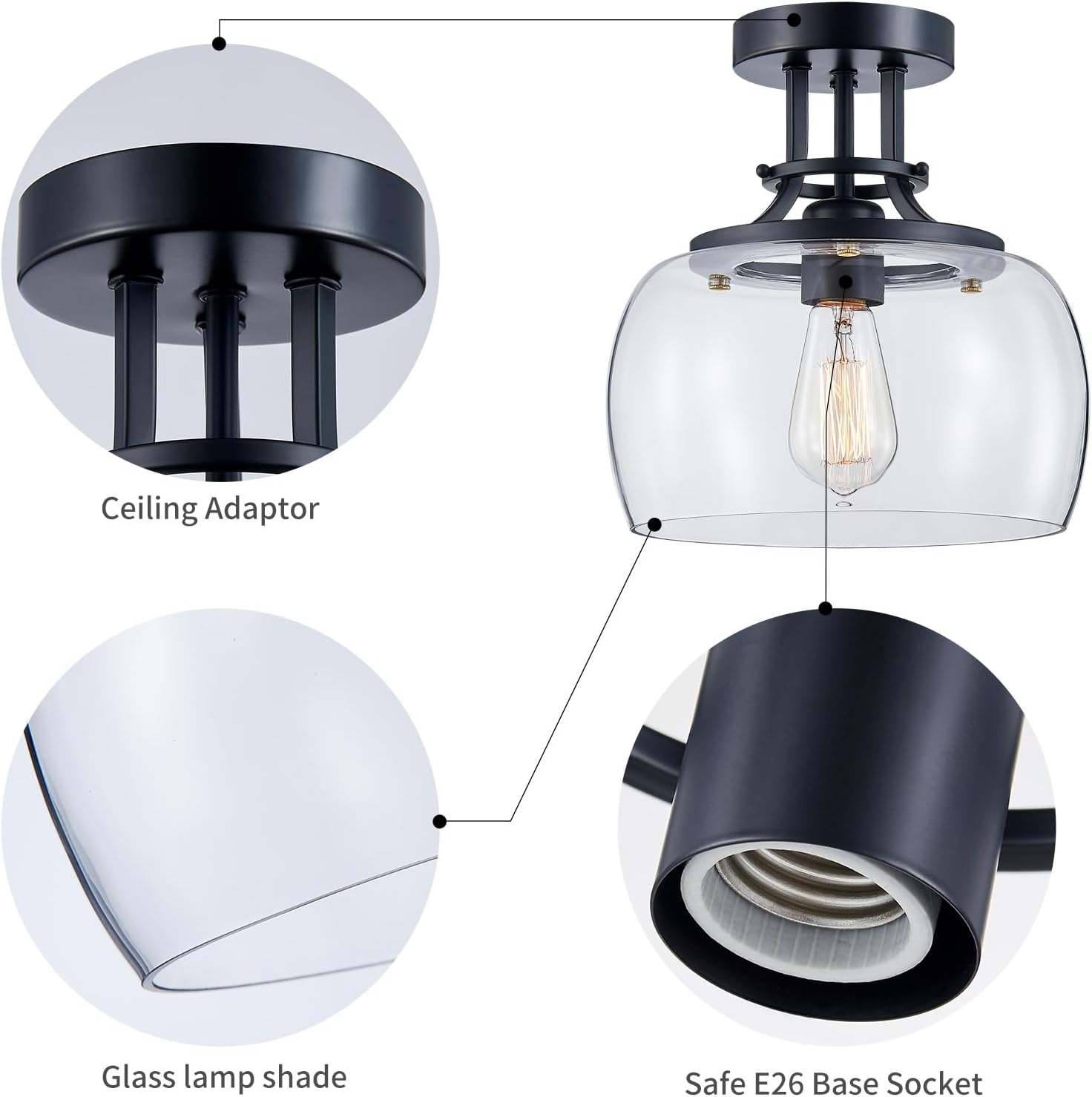 WUZUPS Chandelier Rustic Farmhouse Industrial Round Semi-flushmount Ceiling LED Light Fixture with Clear Glass Shades for Bathroom Kitchen Foyer Entryway, H 10" x W 10", E26 Base, Black
