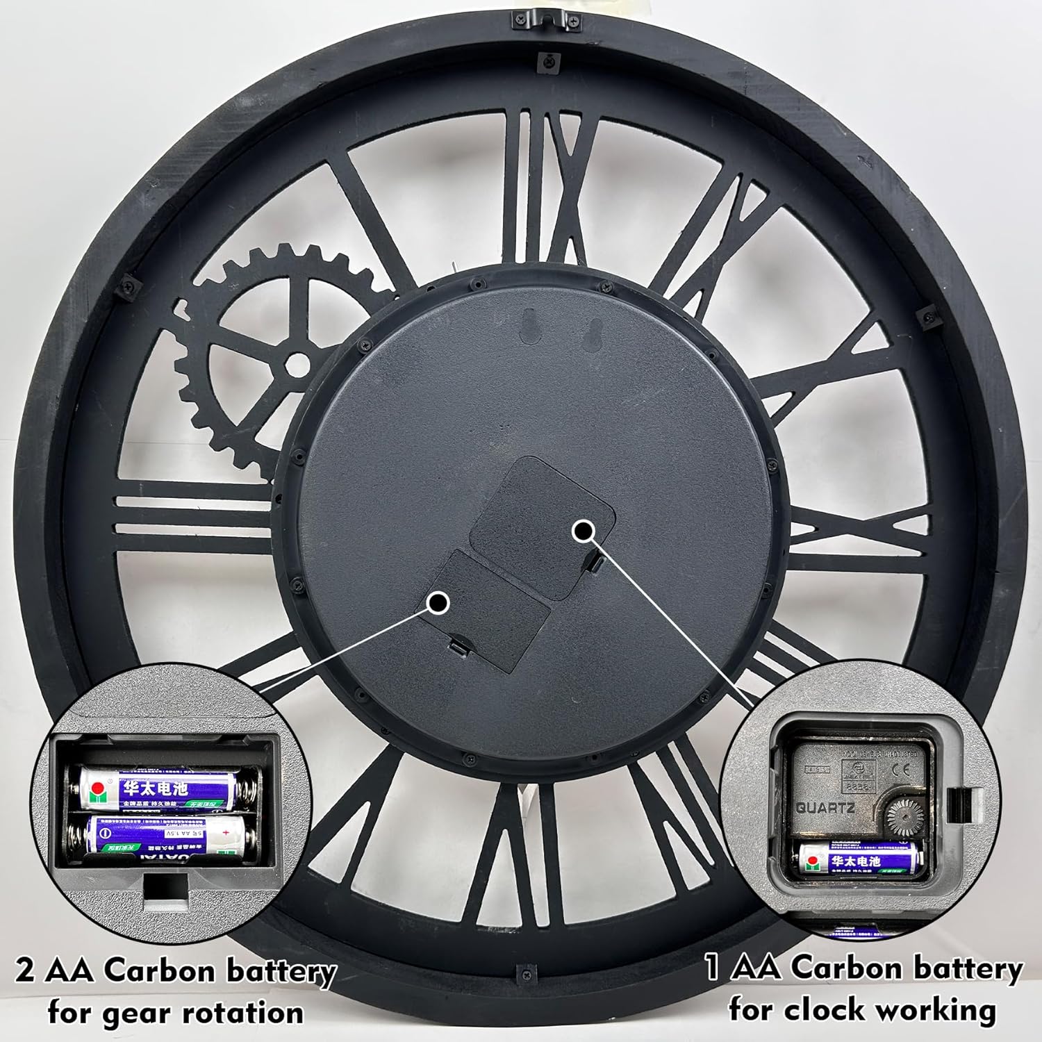 - ACCURATE TIME AND BATTERY OPERATED: Quality quartz sweeping mechanism for accurate time without any ticking sounds. Power by 3 AA Carbon battery operated (not included), large industrial clock takes 2 sets of batteries, one set for the clock and the other for gears that spin. Both of them can be used individually