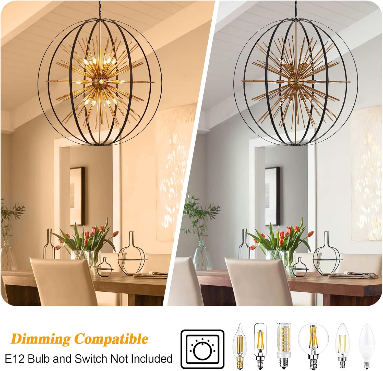 - 【Compatible with Various Bulbs】Sputnik Light Fixture features compatibility with dimmer,18 E12 bulbs base (Switches and Bulbs NOT Included). You can also install LED, Incandescent, or CFL bulbs. The Chandeliers For Entryway emit a warm and inviting glow, creating a cozy atmosphere that elevates the mood of your space.