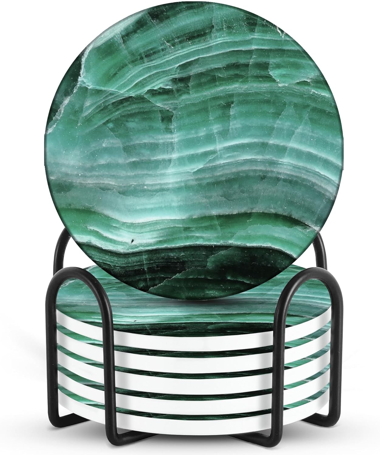 - SOLID NATURAL CERAMIC MATERIAL: Our coasters for drinks are handcrafted with all natural 100% ceramic and cork. The set includes 6 stone coasters with cork bottoms and 1 sleek iron storage rack holder that can neatly stack your coasters. Perfect for wet glasses, hot coffee or tea, and preventing ring stains on coffee tables or counter tops.