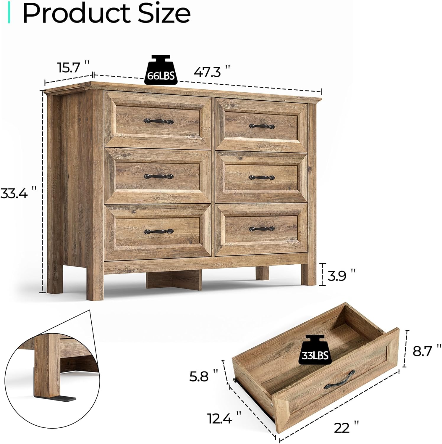 LINSY HOME 6 Drawer Double Dresser for Bedroom, Modern Farmhouse Wide Chest of Drawers, Dressers Organizer for Living Room, Closet, Hallway, Rustic Brown