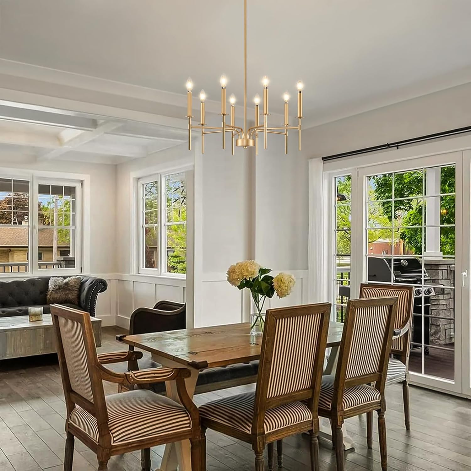 - Dimmable and E12 Bulb Compatibility: With 8 E12 candelabra sockets, this gold chandelier is compatible with various E12 bulbs (incandescent, LED, CFL, and halogen, 40W MAX / bulb), offering dimmable functionality to create the perfect ambiance. This gold matte chandelier allows for flexible lighting control, making it suitable as a gold chandeliers for dining room, or master bedroom chandelier (NOTE: bulbs and dimmer are NOT included)