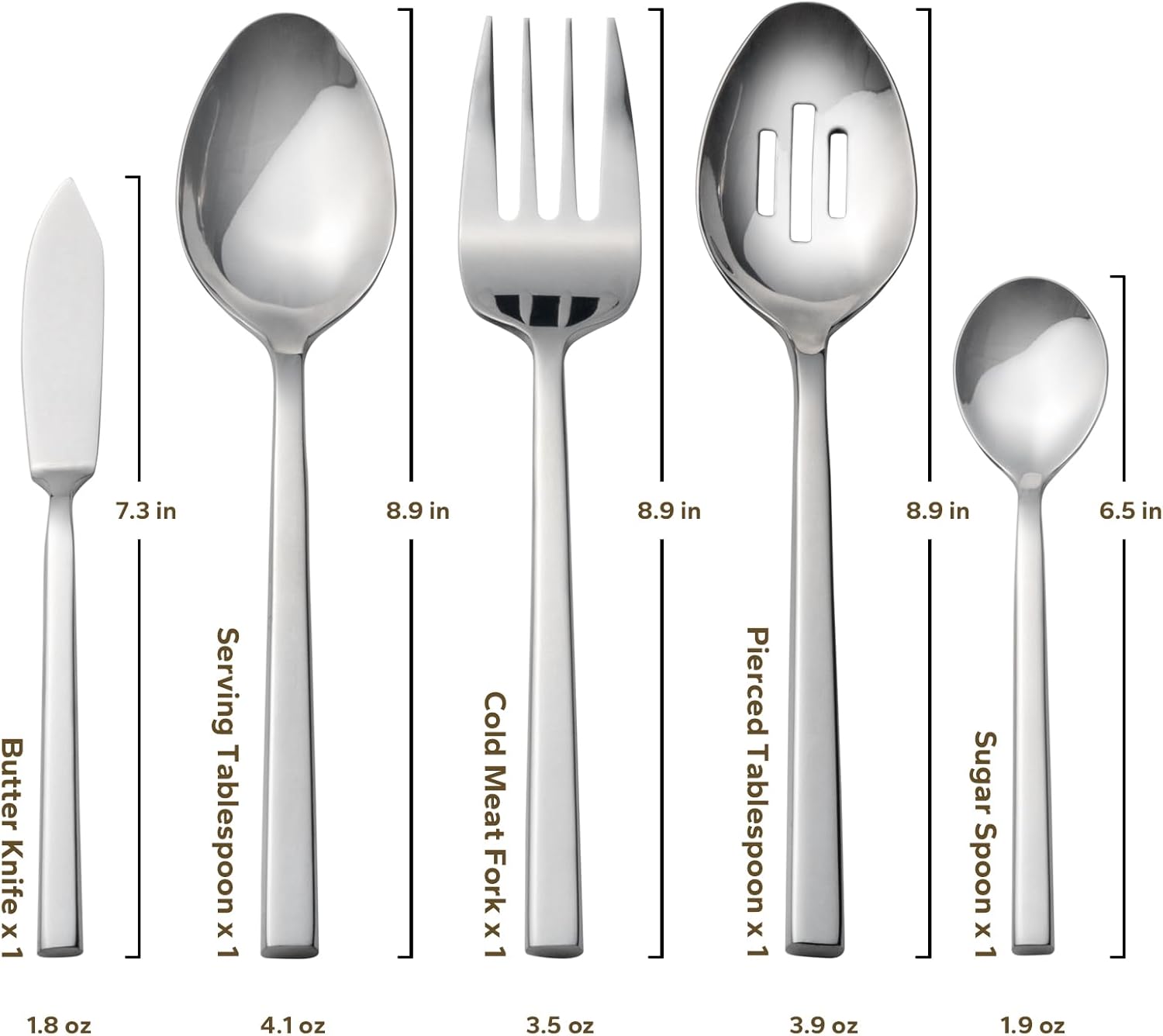 - INLUDES: 45-piece flatware set with service for 8. Includes 8 each: dinner knife, dinner fork, salad fork, dinner spoon and teaspoon. Plus 1 each:serving tablespoon, pierced tablespoon, cold meat fork, butter knife, and sugar spoon