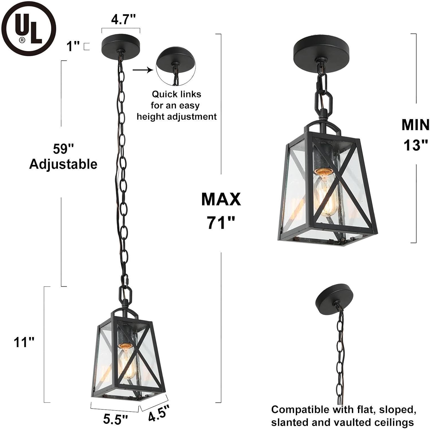 - Ideal Size & Suited Space: The gazebo hanging light size is 5.5β L x 4.5β W x 11β H.; The canopy size is 4.7" D x 1" H, which can cover the standard junction box. Sloped and vaulted ceilings are compatible. Equipped with a 59" adjustable hanging chain, this outdoor porch light can be hung from Min 11" to Max 71". With its classic design, it adds a sense of modern farmhouse feeling to porches, garages, gazebos, yards, and gardens. Also suited to indoor places, like the kitchen island or hallway.