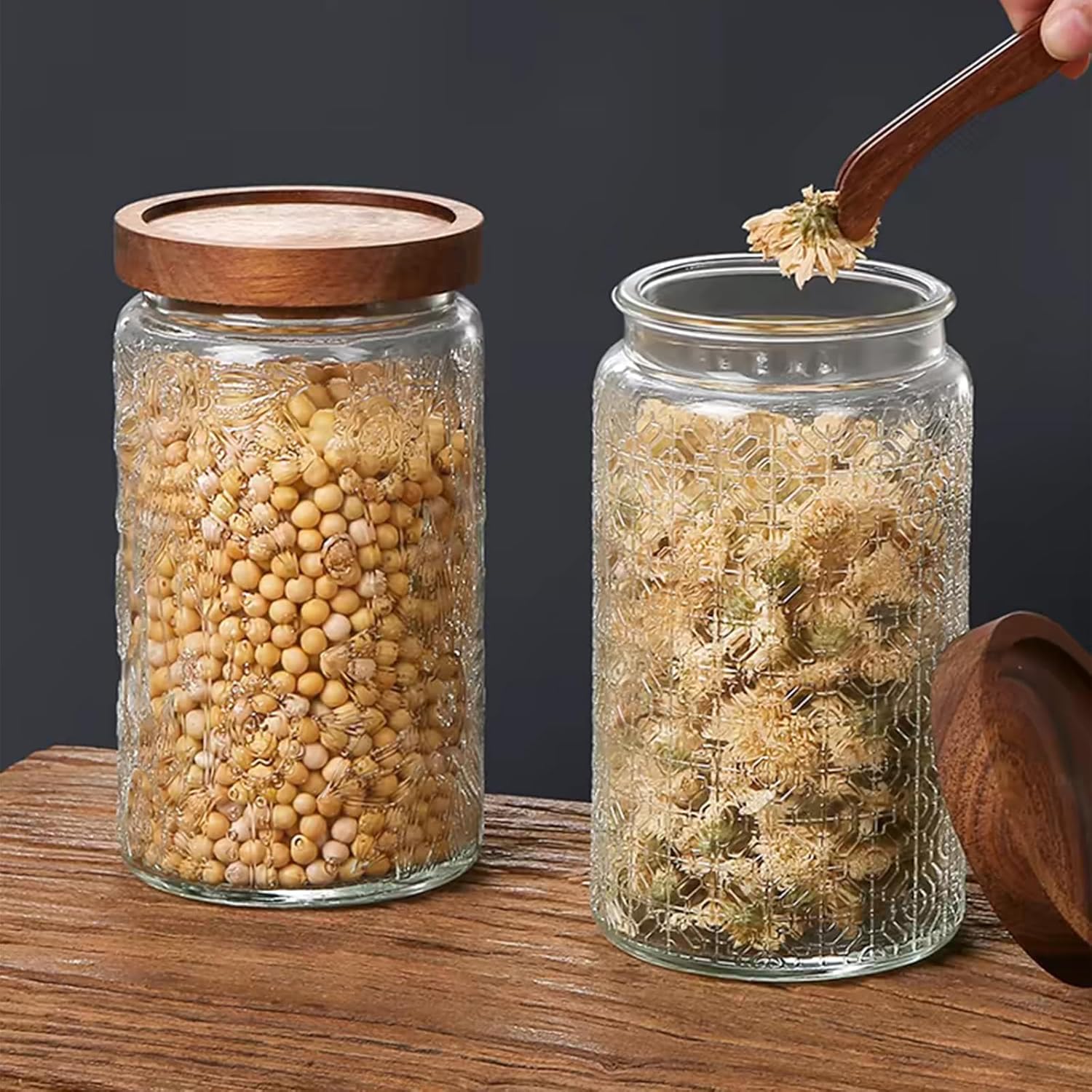 - Vintage Design: Daisy, Sunflower, Stars, Carved flowers, window carving, The glass jars with airtight lid have a vintage cameo inspired by nature and ancient cultures. The glass jars with airtight lid are inspired by nature and ancient cultures, and reflect the charm of light and shadow on the glass, which not only makes your kitchen neat, but also very elegant