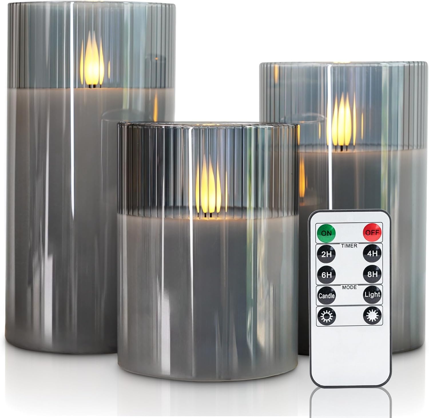 Amagic Grey Flameless Candles with Remote, Battery Operated Candles with Timer, Ribbed Glass LED Pillar Candles with Flickering Flame for Spooky Halloween Party Decor, Real Wax, Set of 3