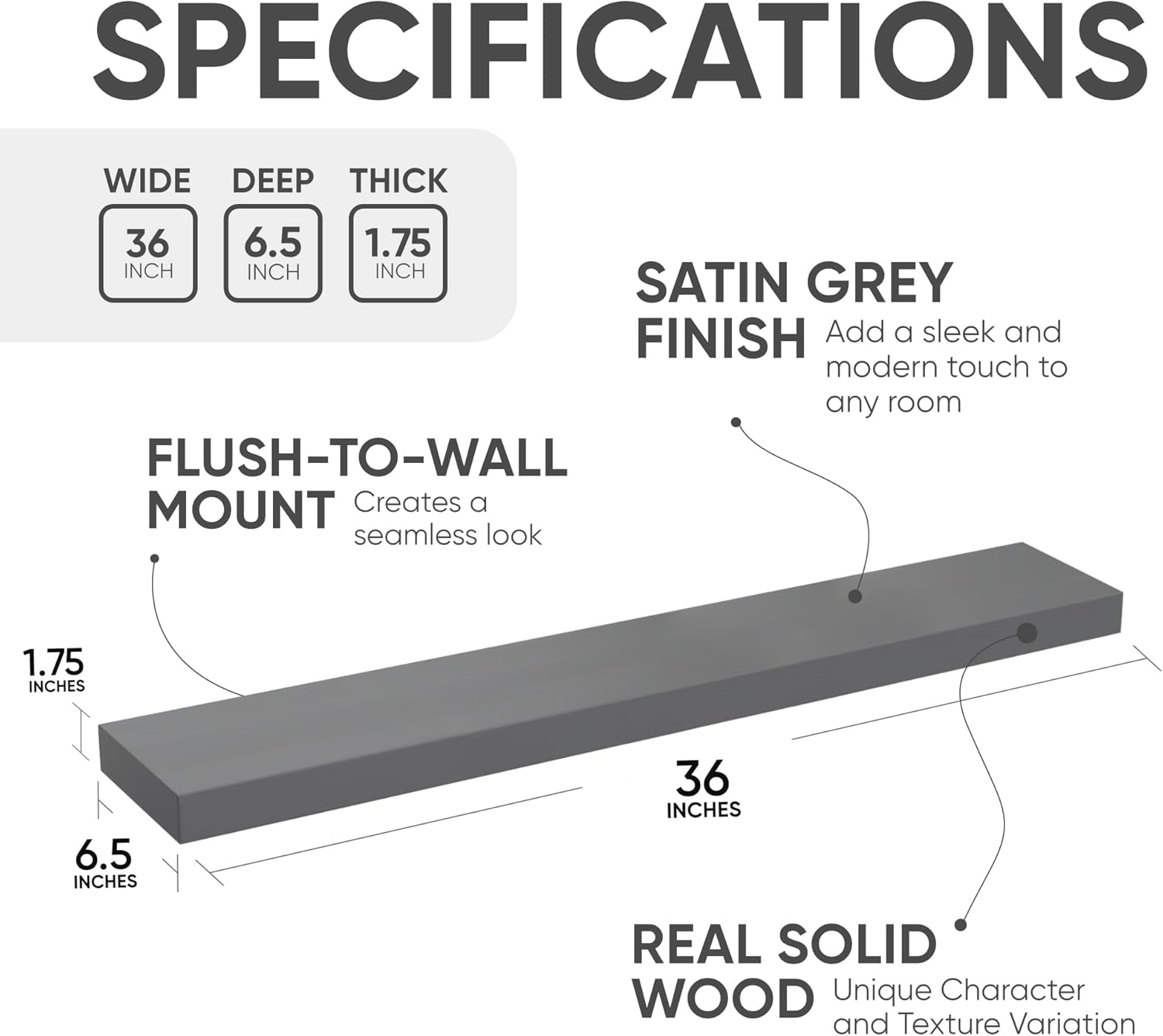 Homeforia 36 inch Gray Floating Shelves, High End Solid Real Wood 36inch Floating Shelf for Wall Mounted, Grey Wooden 36 inches Long Floating Shelves, Heavy Duty Bracket, 36 X 6.5 X 1.75 in, Set of 2