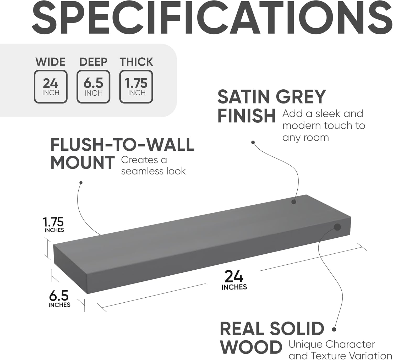 - AUTHENTIC WOOD GRAIN - Enjoy the timeless elegance of real wood. Handcrafted from the finest 1.75" Thick natural pine wood measuring 24" Wide x 6.5" Deep x 1.75". Our shelves highlight the inherent charm and durability of high-quality wood. Each Shelf reveals its unique character of knots and natural wood grain; each ledge is a little different but equally stunning.