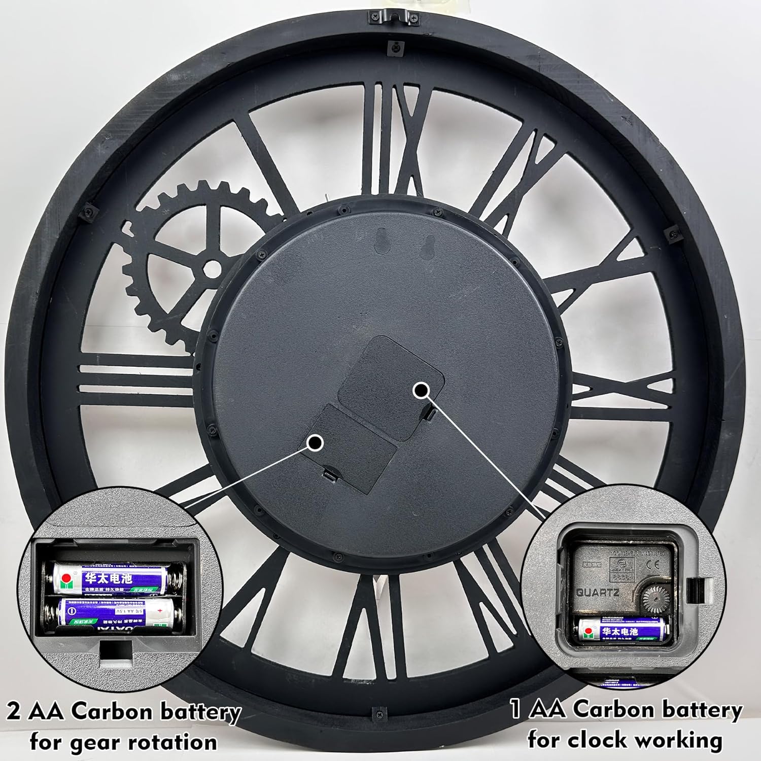 - REAL MOVING GEARS: Large wall clock with unique moving parts is as attractive as it is functional. Put batteries in, various gears start rotating fluently. Moving gear wall clock is amazing looking on the wall and will get so many compliments on it. Made from solid wood and painted by Rust-like color on wall clock create a very rustic and industrial atmosphere. Farmhouse wall clock is professionally handmade and pursuit of naturalness, so it may have some little imperfections.