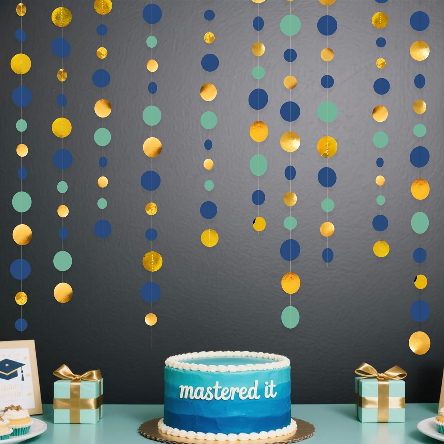 Blue Gold Green Decorations Circle Dots Garland Metallic Gold Navy Blue with Sage Green Hanging Polka Dot Streamer for Birthday Baby Shower Bridal Shower Wedding Bachelorette Engagement Party Supplies
