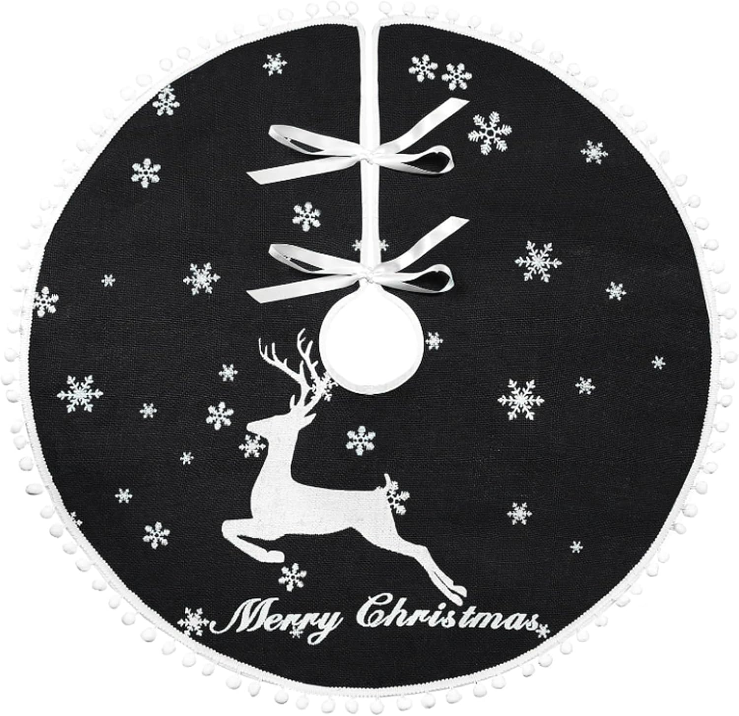 - Merry Christmas Tree Skirt:Our Christmas tree skirts is printed with elk and various sizes of snow patterns, as well as the words "Merry Christmas." The edges are adorned with small, fluffy balls, adding a festive touch to your Christmas tree. This 48-inch tree skirt is perfectly sized for most Christmas trees perfectly. Before making a purchase, please measure the diameter of your tree to ensure a perfect fit