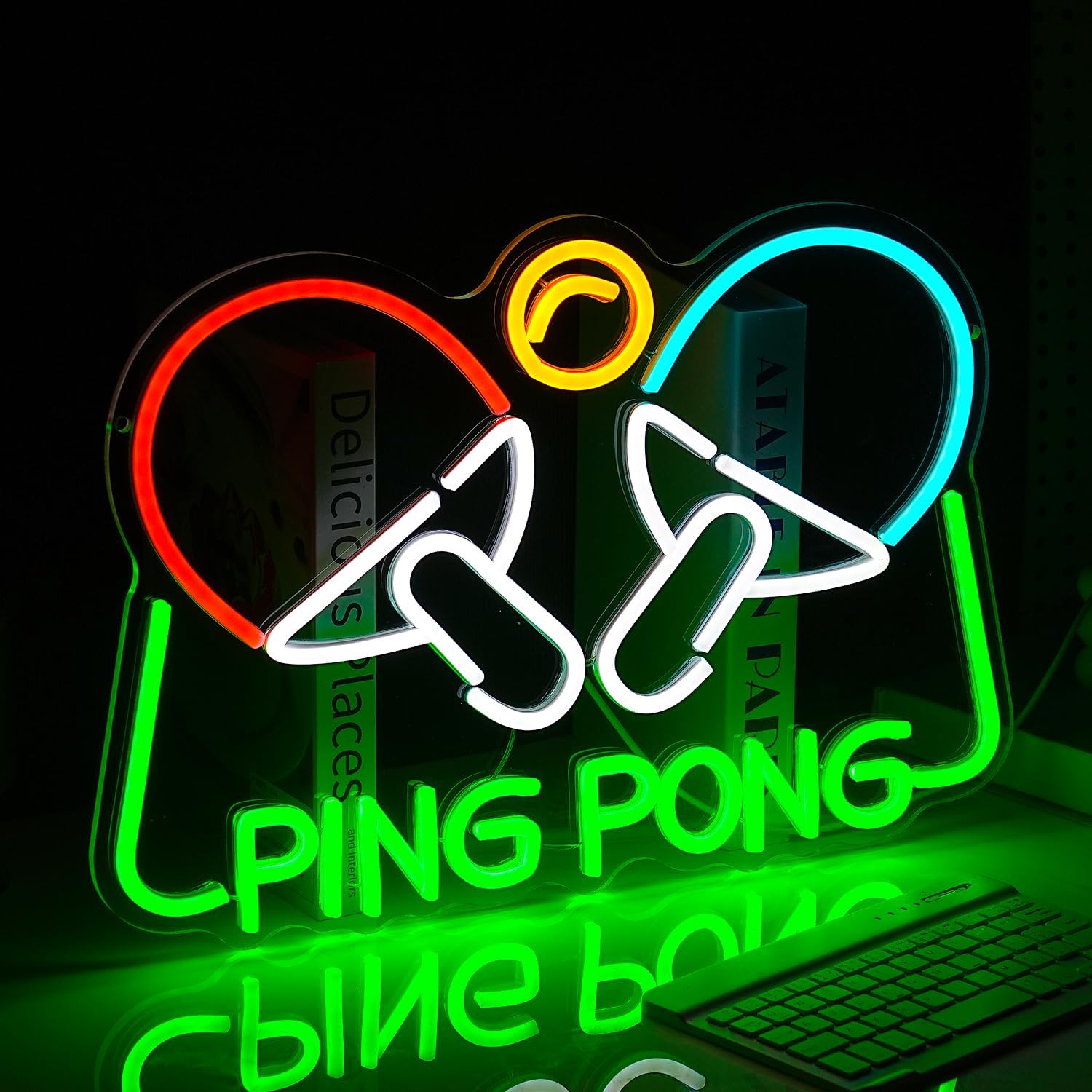 - Safe materials and energy-saving: The Ping Pong sign is made of flexible silicone strips and acrylic backboard, using an advanced electrode system and a 5V low-voltage design, which is durable and safe to use. The backboard has a protective film to prevent scratches.