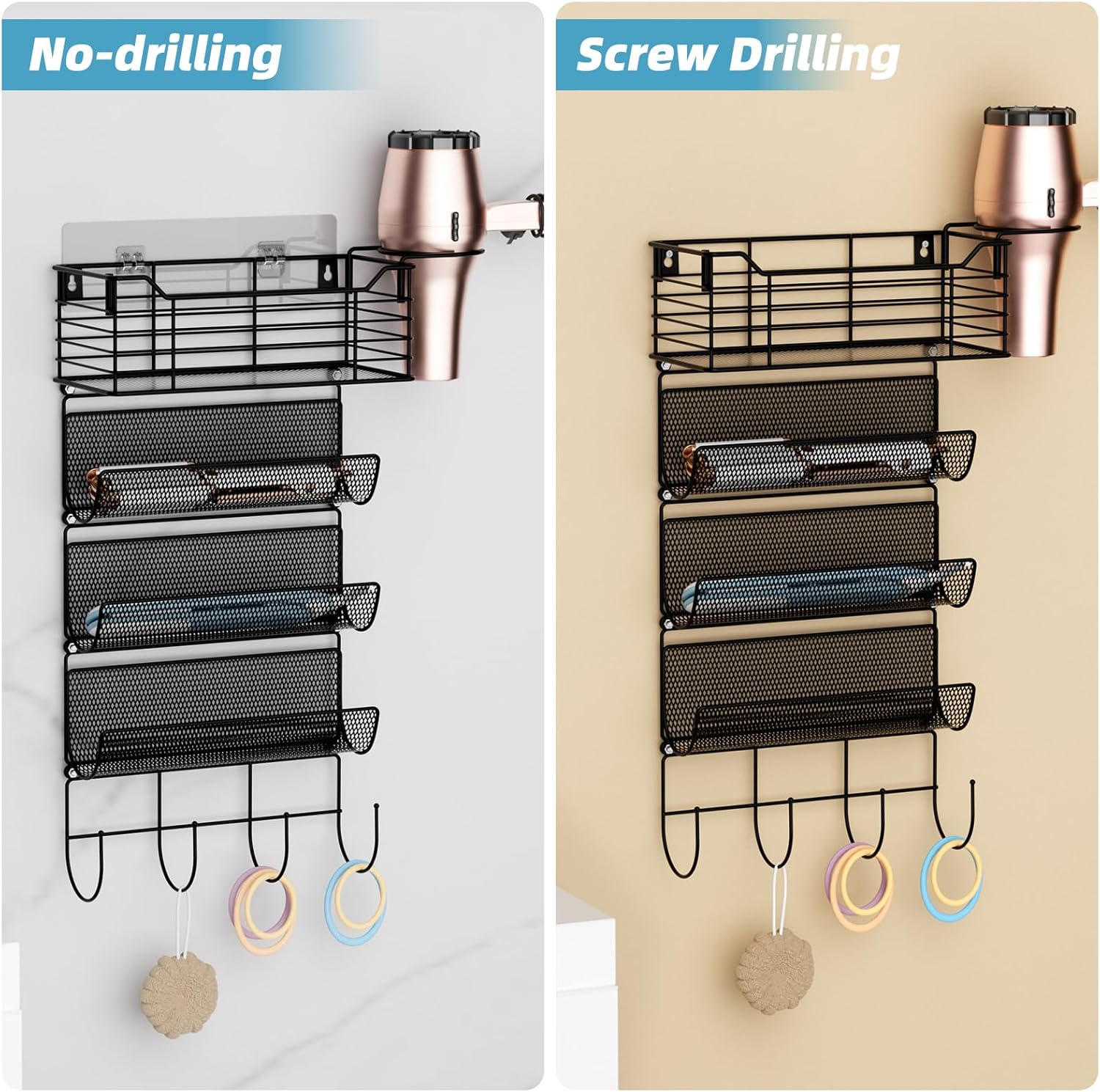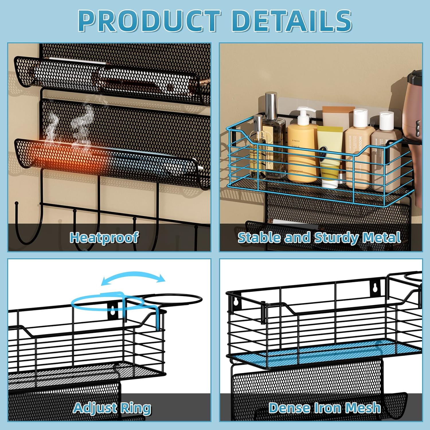 • 【1 Basket/4 tiers Shelf】The hair tool organizer includes 1 metal basket, 3 mesh holders, 1 hairdryer holder, and 1-row hook. Separate all your hair tools, such as curling iron, blow dryer, straightener, etc.