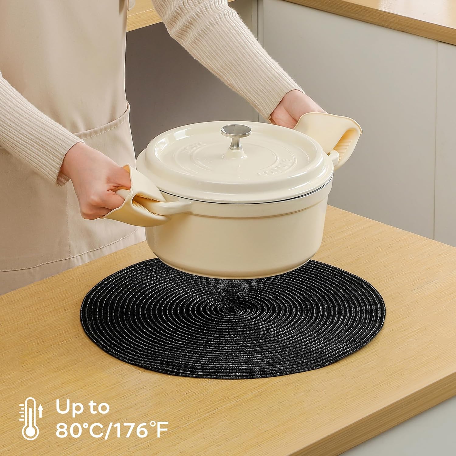 • Protect Your Dining Table: Our placemats can withstand temperatures up to 176°F (80°C), protecting your table from stains, hot food, or scratches from tableware. With a diameter of 15 inches, they perfectly fit a variety of tableware
