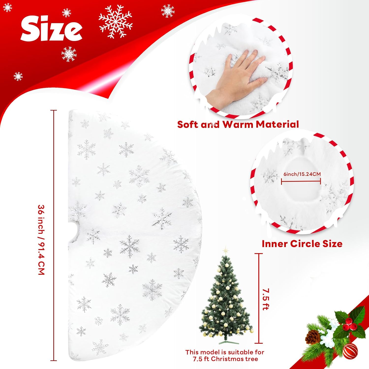 Christmas Tree Skirt 36 Inch, Holiday Part Decorations for Christmas Tree, Whit Plush Sliver Sequin Snowflake Tree Shirt for Xmas