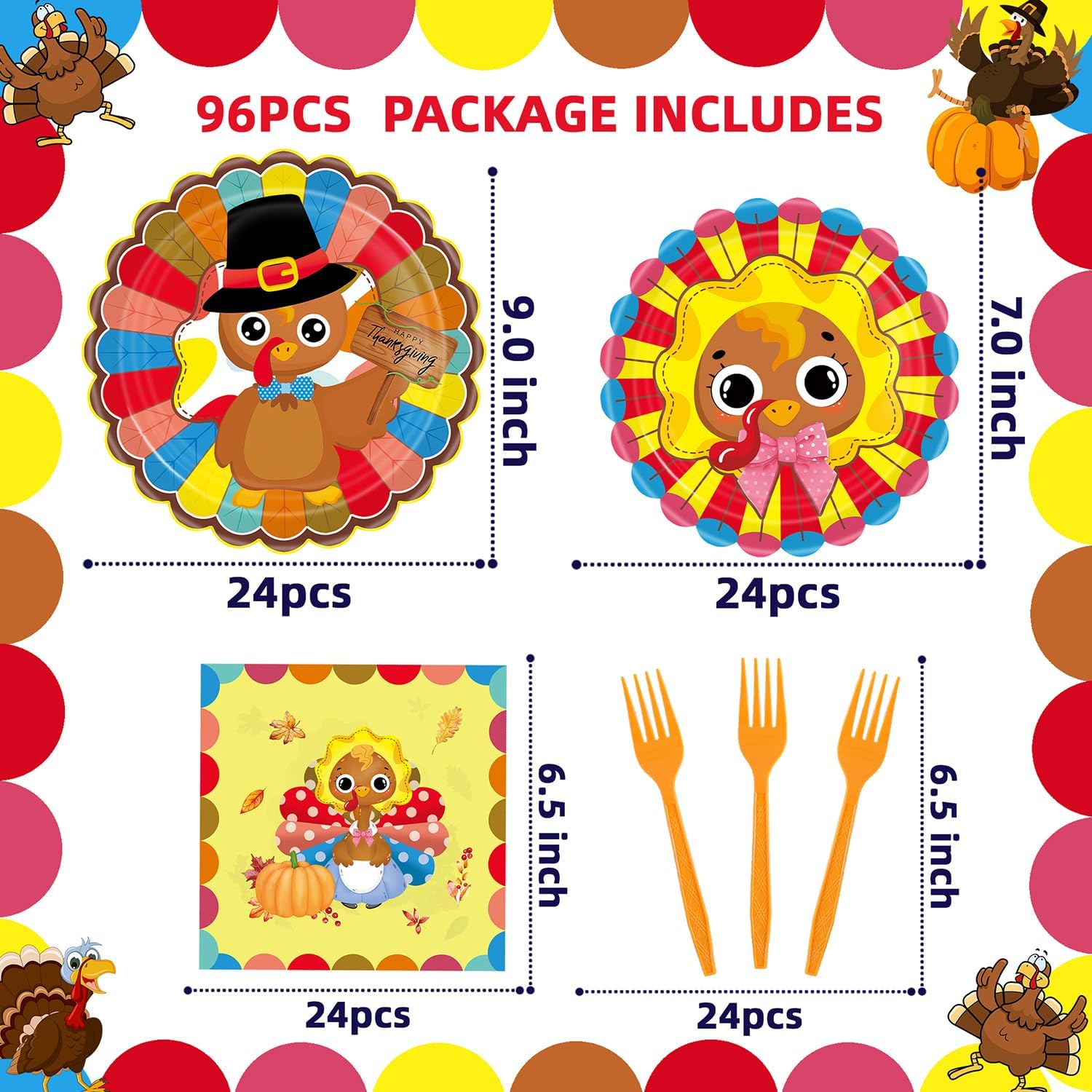 - Thanksgiving Party Decoration Set: You will receive totally 96 piece turkey theme party supplies, including 24 Thanksgiving plate 9inch,24 pieces turkey plate 7inch๏ผ24 pieces Thanksgiving napkin and 24pcs forks,The Thanksgiving party favors are enough to decorate your party
