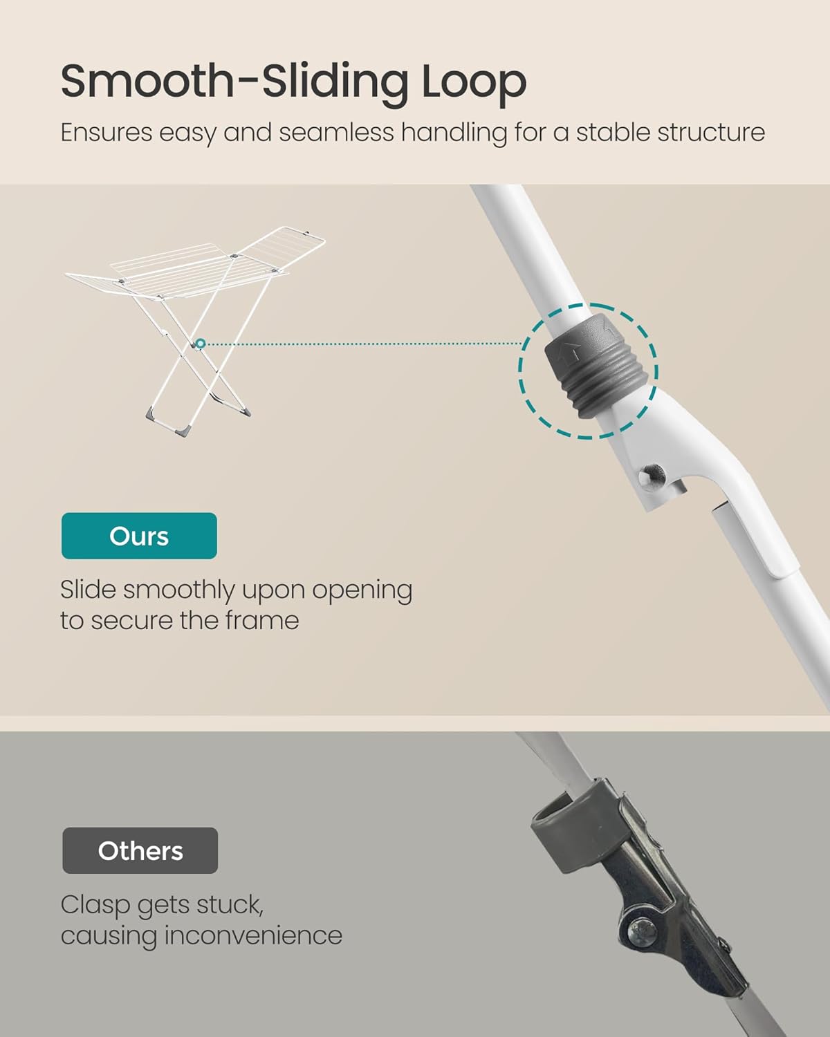 - [Thoughtful Details] This drying rack features a smooth-sliding loop, a plastic clip that keeps wings securely in place when folded, and floor-friendly plastic feet