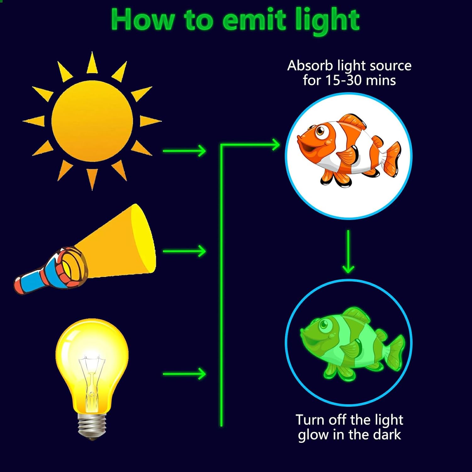 - β¦ Glow Under the Sea Wall Decals: These glow wall decals for ceiling are made of quality luminous material,they will glow brightly when absorb enough light during the day. You just need to put it under lamplight flashlight ,room light or sunshine for 15 minutes, it will keep glowing for 8-10 hours with a gentle green fluorescent light. Please ensure the light shines on the decals without obstruction, the longer it takes to absorb light, then to light up for up to longer.