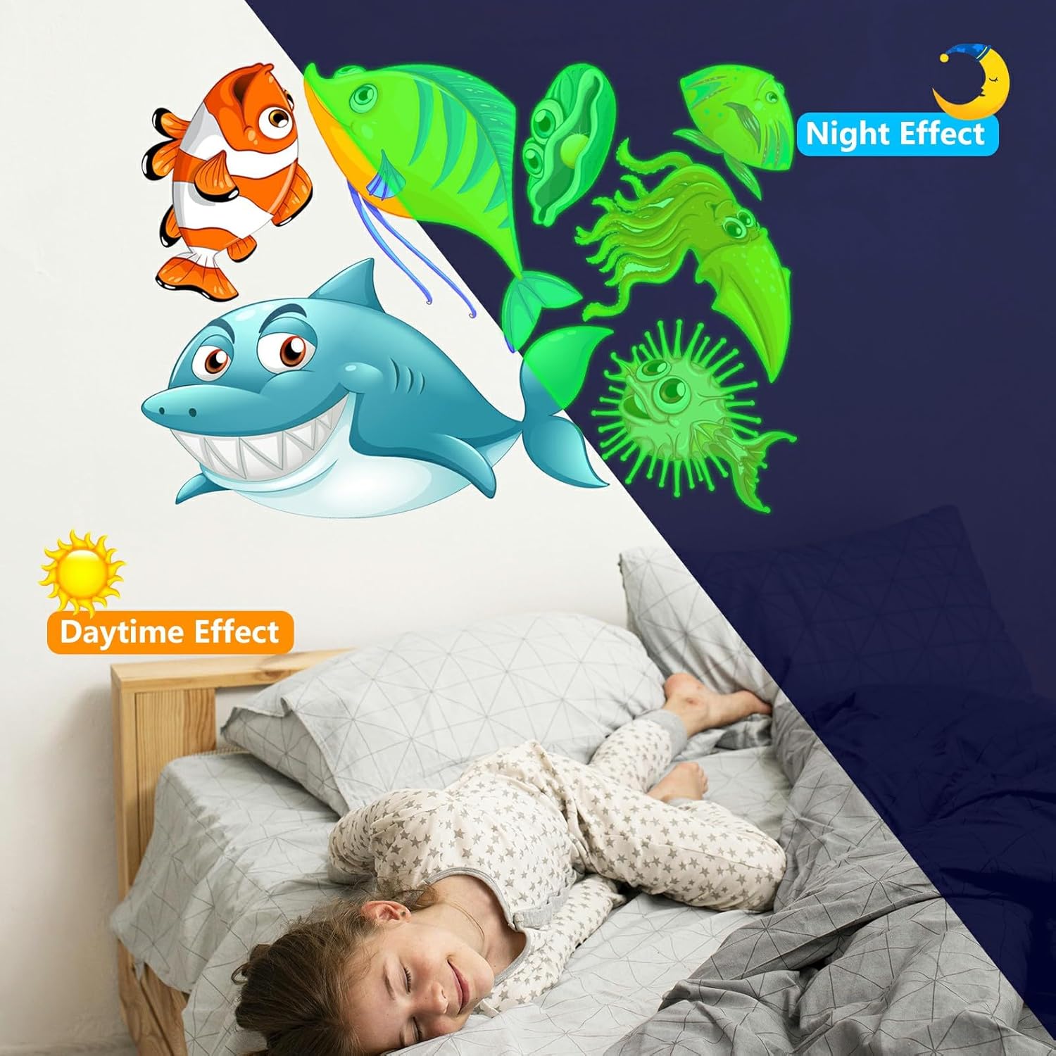 - β¦ DIY Wall Decals: You will get 4 sheets (Size of each sheet: 11.8 x 8.26 inch) of glowing sea creatures wall decals in a set, in various shapes and sizes such as whales, jellyfish, turtles, octopus, seahorses, octopus, starfish, shells, tropical fish and more. can be easily matched with a variety of home decoration styles, children can DIY a fairy-tale ocean world according to their own preferences.