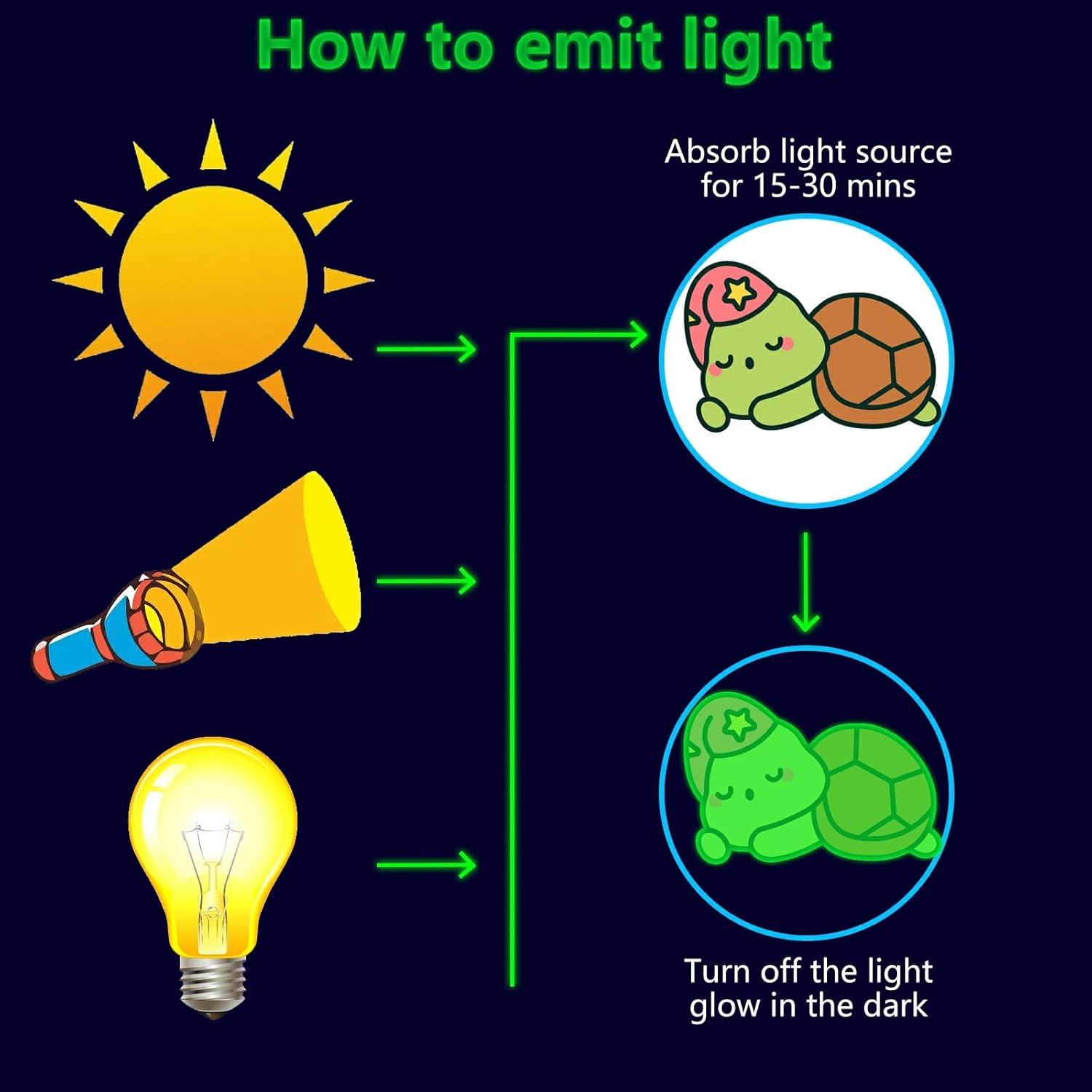 - β¦ Glow Turtles Wall Decals: These glow wall decals for ceiling are made of quality luminous material,they will glow brightly when absorb enough light during the day. You just need to put it under lamplight flashlight ,room light or sunshine for 15 minutes, it will keep glowing for 8-10 hours with a gentle green fluorescent light. Please ensure the light shines on the decals without obstruction, the longer it takes to absorb light, then to light up for up to longer.