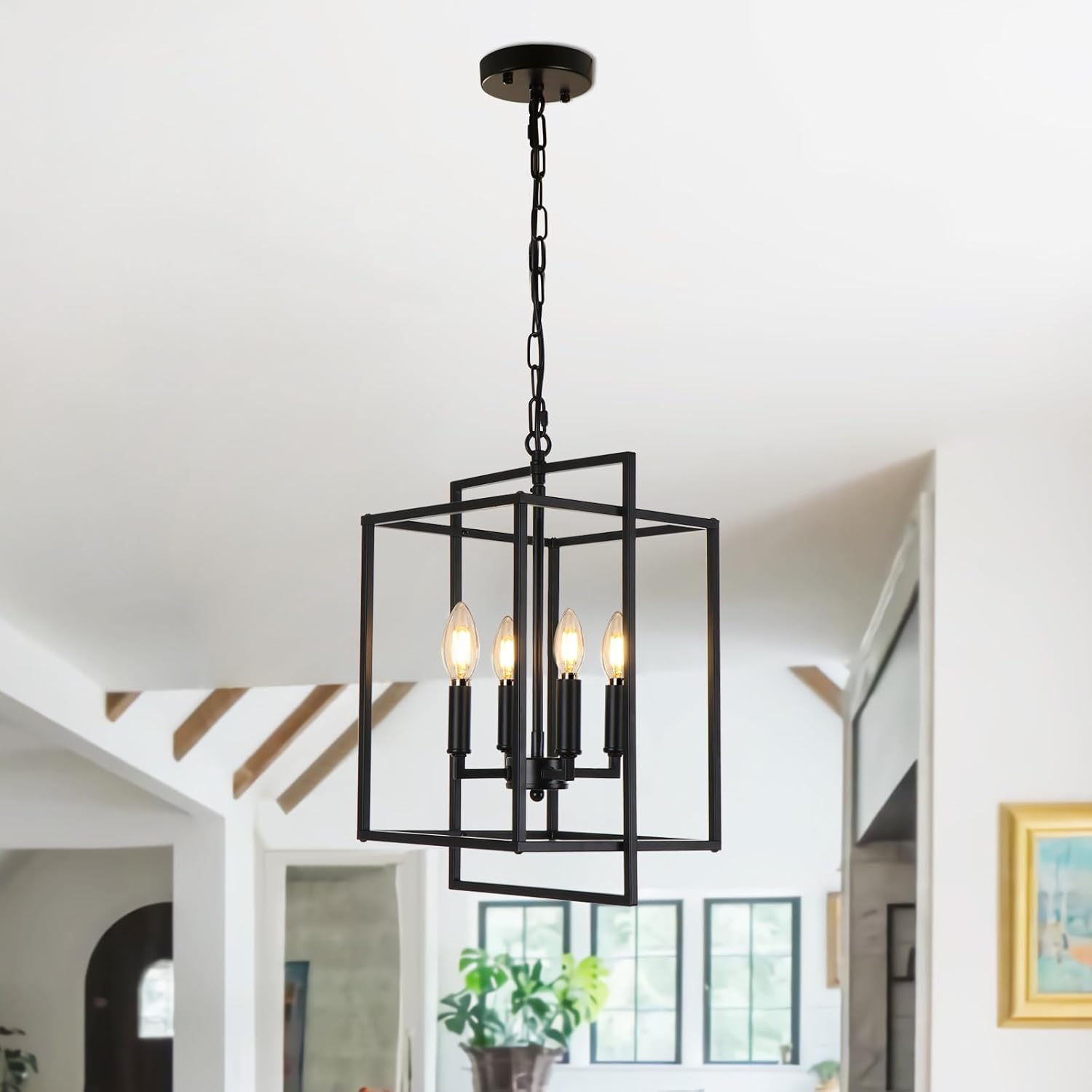 4-Light Vintage Black Chandelier, Foyer Lighting Fixtures Farmhouse Chandeliers for Dining Room, Modern Industrial Lantern Pendant Light for Kitchen Island Entryway Stairway