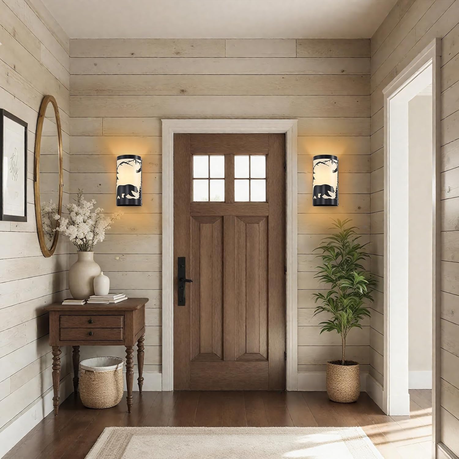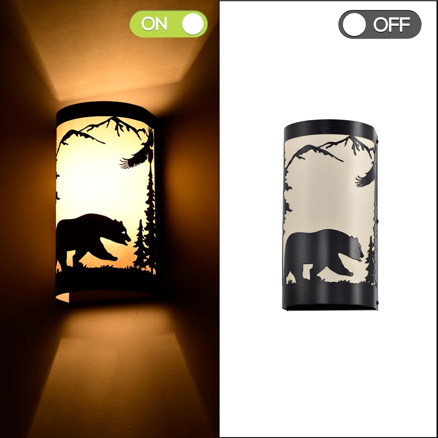 - Rustic Design: Black wall sconces set of two is crafted from durable matte black metal,featuring intricate forest elements and a bear silhouette,white parchment paper adds a soft,warm glow,enhancing industrial aesthetic of the vintage wall sconce