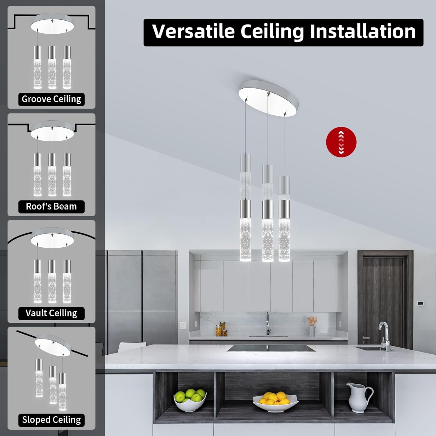 OKELI Dimmable LED 3-Light Pendant Light for Kitchen Island, 18W 1350LM Modern Bubble Crystal Island Light Fixture,6000K, Electro-Chrome, Easy Installation, Round