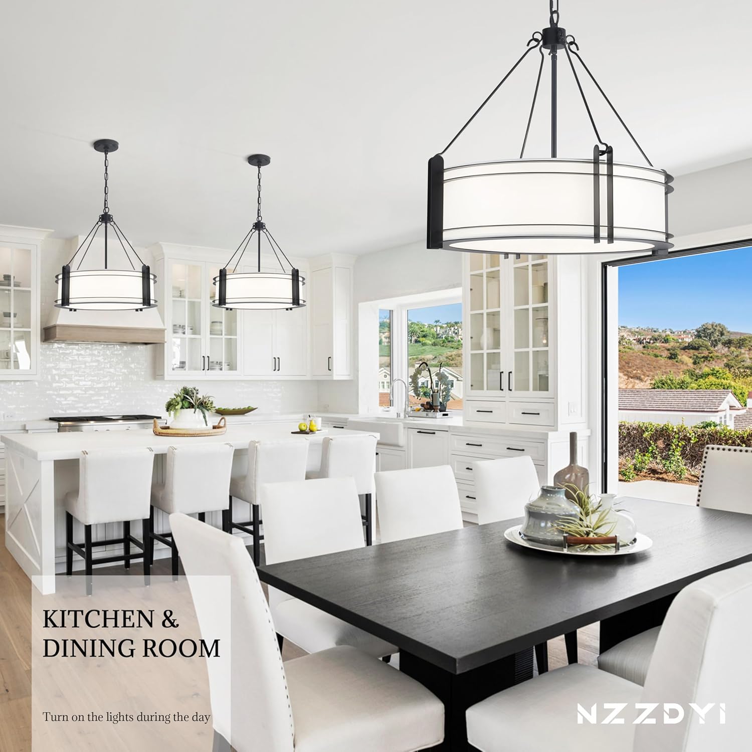 - 【Modern Drum Chandelier】Transform your space with the black farmhouse chandelier,a sleek fusion of modern and classic styles.Featuring a black metal frame and white fabric shade,it casts a gentle,eye-friendly glow.This drum chandelier is Ideal for kitchen island,dining rooms,living room or bedroom,adding a touch of warmth and elegance to any decor