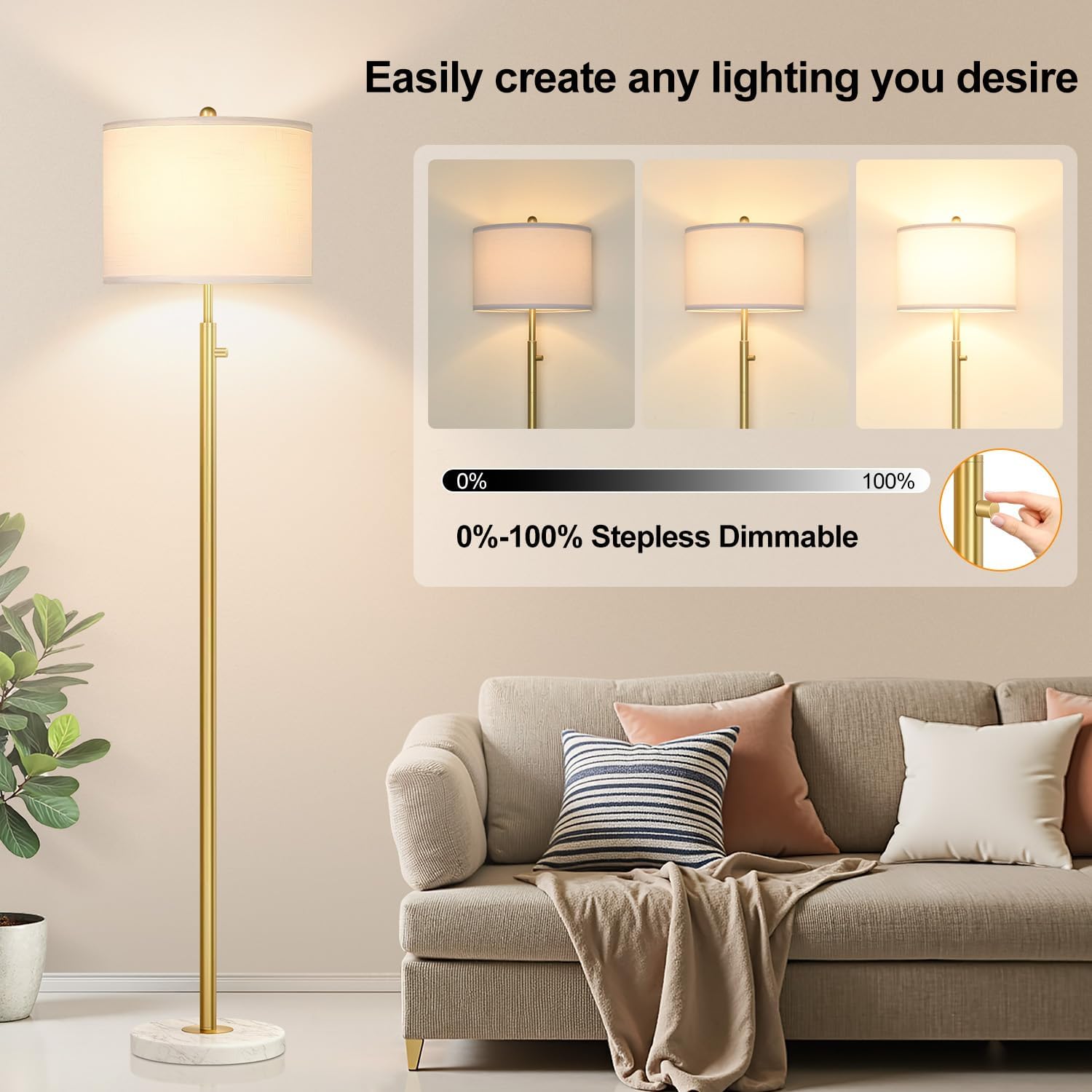 - Stepless Dimming (0-100%) : Unlike traditional 3-way dimmable floor lamps, our dimmable floor lamp features fully stepless dimming, making it suitable for various room styles and lighting needs. With a simple turn of the knob, you can easily adjust the brightness to your preference, whether for your living room or bedroom