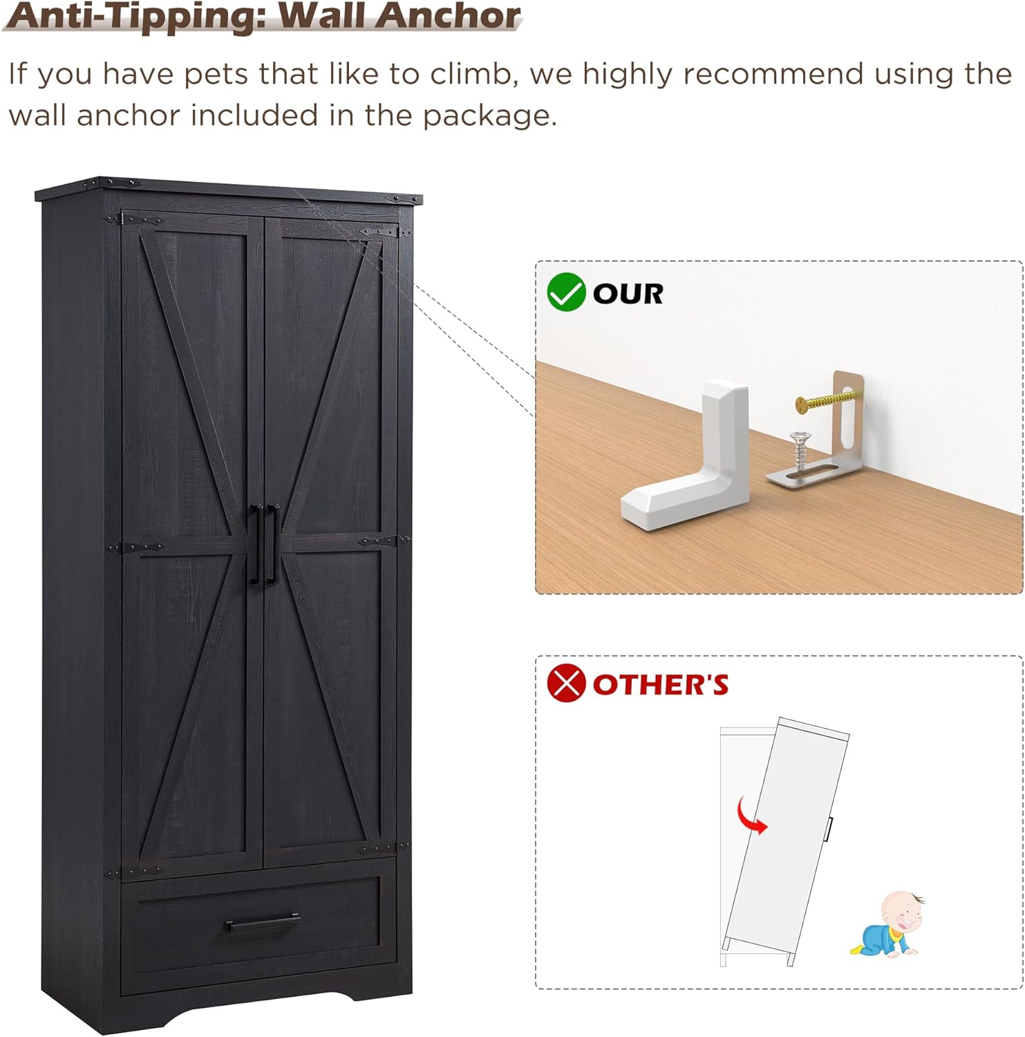 - Sturdy and Safe Design: Crafted from high-quality engineered wood and metal, this cabinet is built for stability and longevity. It includes an anti-tip safety kit for secure wall mounting, ensuring stability even in households with pets. Enjoy peace of mind knowing your family’s safety is a priority