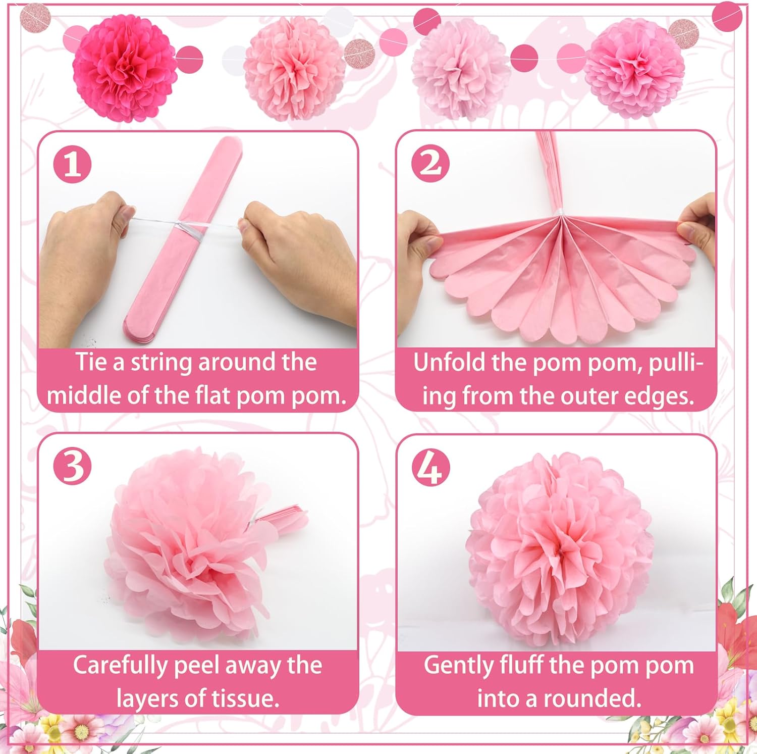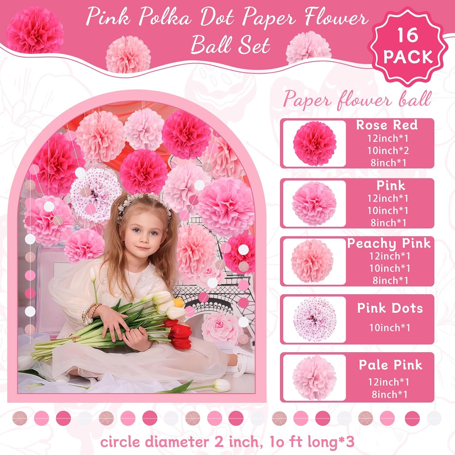 - [pink party decorations]: This paper pompom decoration set includes 13 paper pompom flowers of different sizes (4 roses color, 3 peachescolor, 4 bright pinks, 2 light pinks, 1 pink polka dot), which are 12 inches, 10 inches and 8 inches respectively, and includes 3 polka dot paper garlands (each 9.8 feet long).