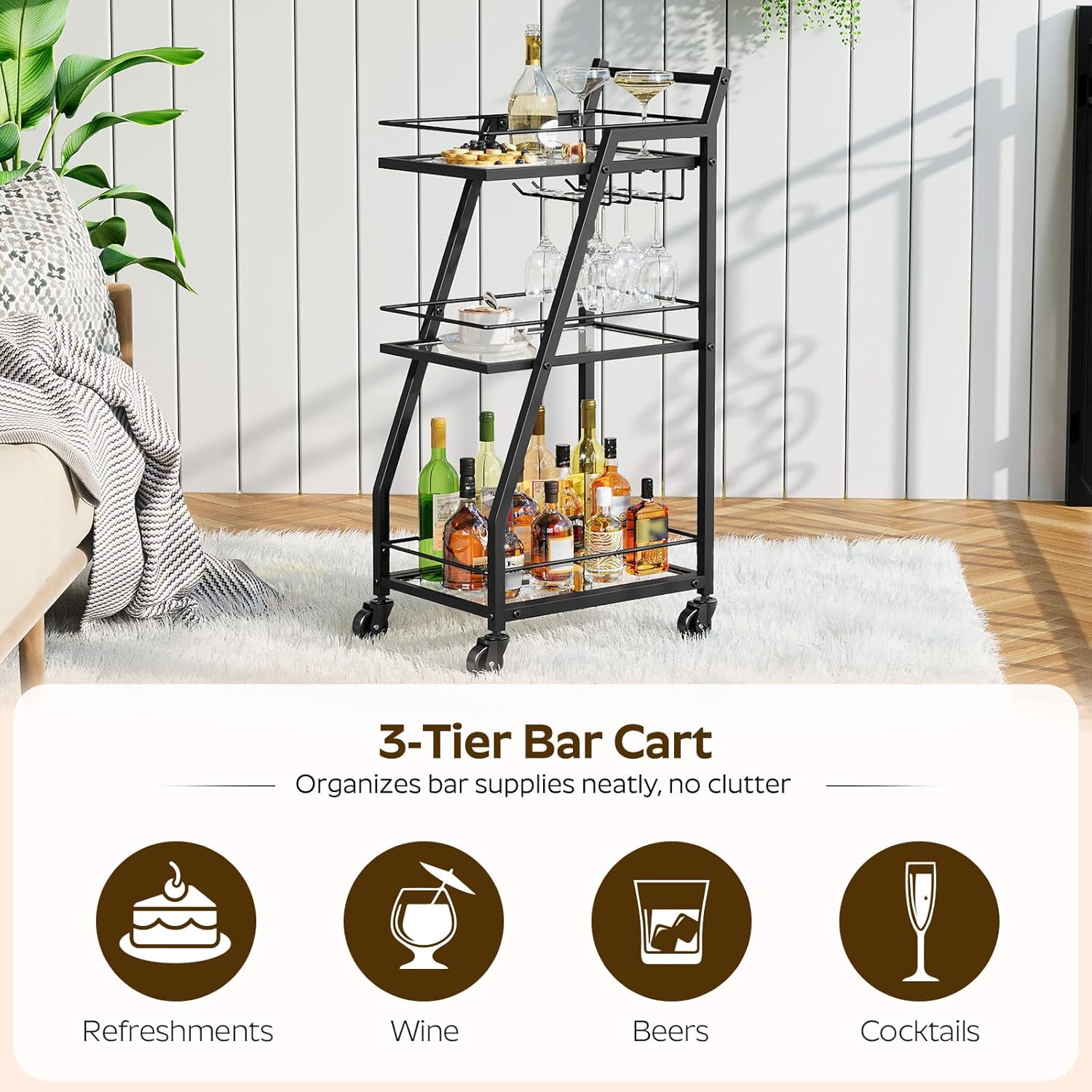 - Cup Holders Included: This bar cart has 2 quality metal cup holders for storing 6 goblets, ensuring stability while the cart is in motion. Whether you're preparing drinks or moving the cart during a gathering, you can use it with confidence