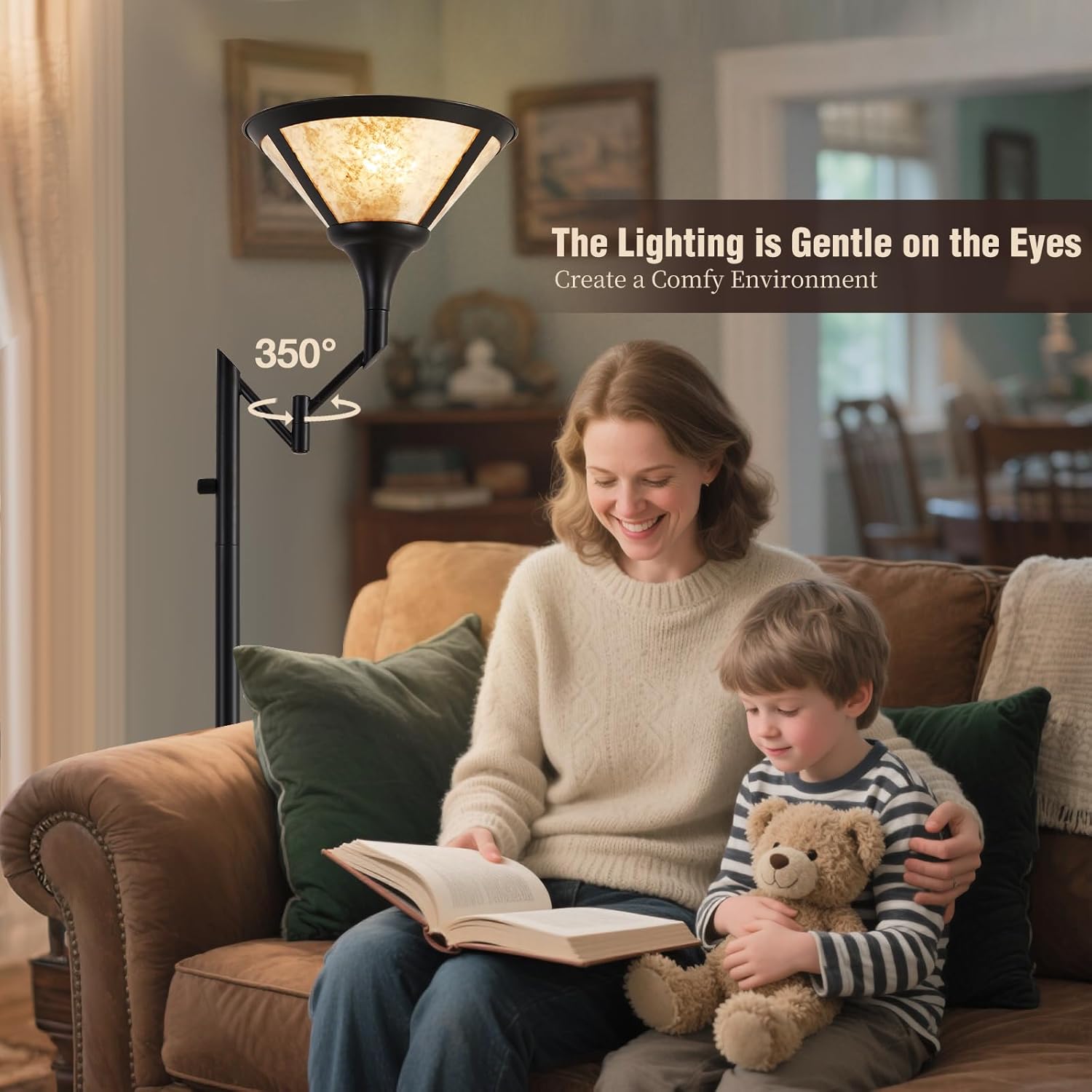 Floor Lamps for Living Room - 70" Black Torchiere Standing Floor Lamp with White Mica Shade - Tall Corner Lamp Decor for Bedroom with Adjustable Swing Arm LED Reading Light for Home Office