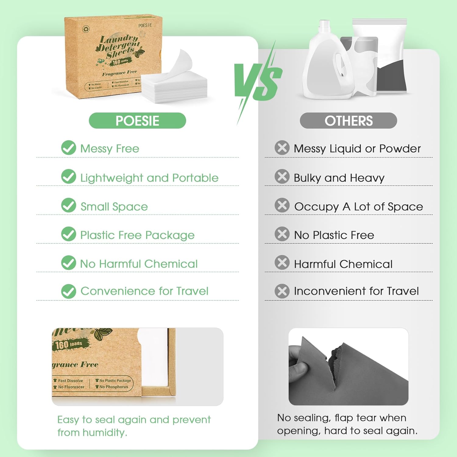 Poesie Laundry Detergent Sheets Fragrance Free 320 Sheets Liquid Free Travel Laundry Soap Non-Plastic Jug Camping Laundry Strips for Home & Outdoor
