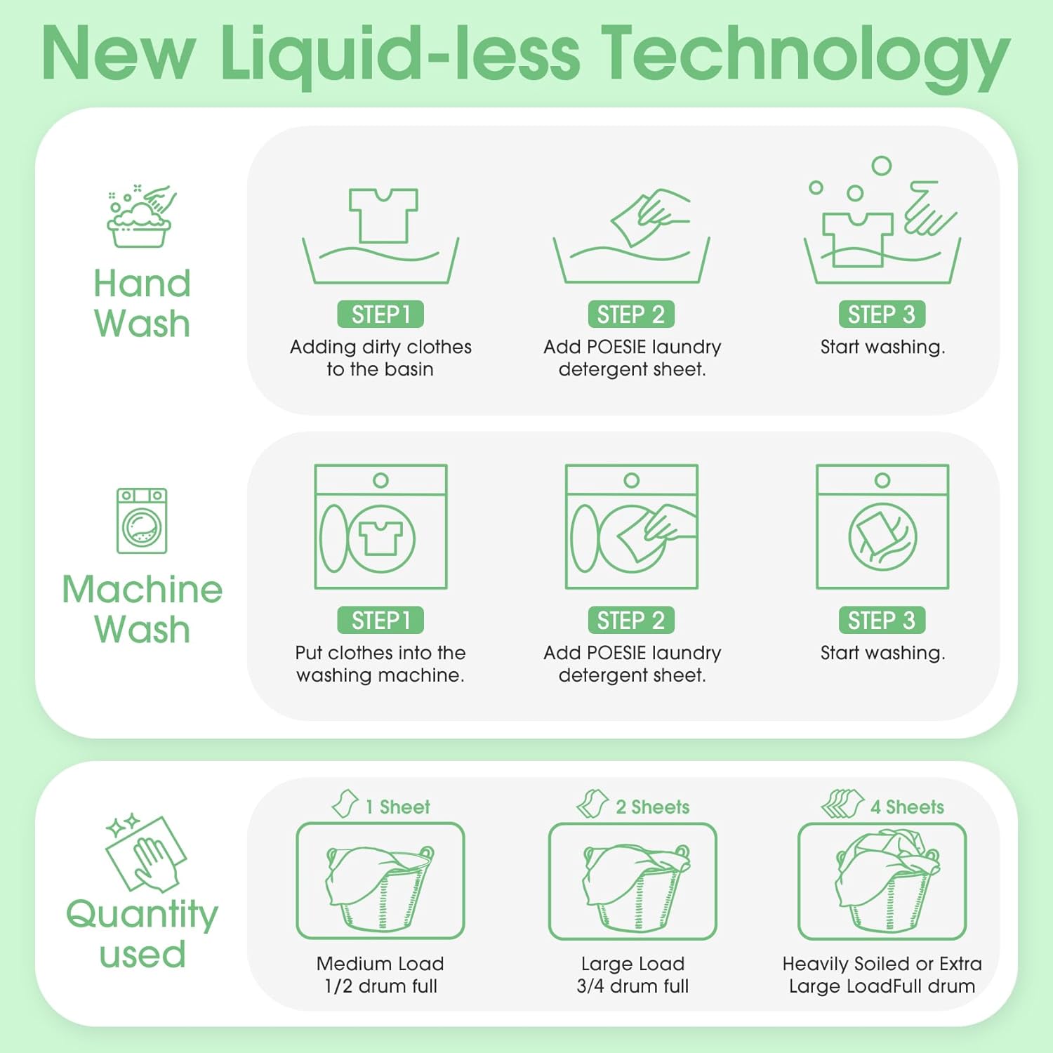 - Easy to Use - Liquidless detergent sheets, 1 sheet for small or medium loads where clothes are not very dirty, 2 sheets for large loads and 4 sheets for extra large loads, no waste. Not too little and not too much to save resources
