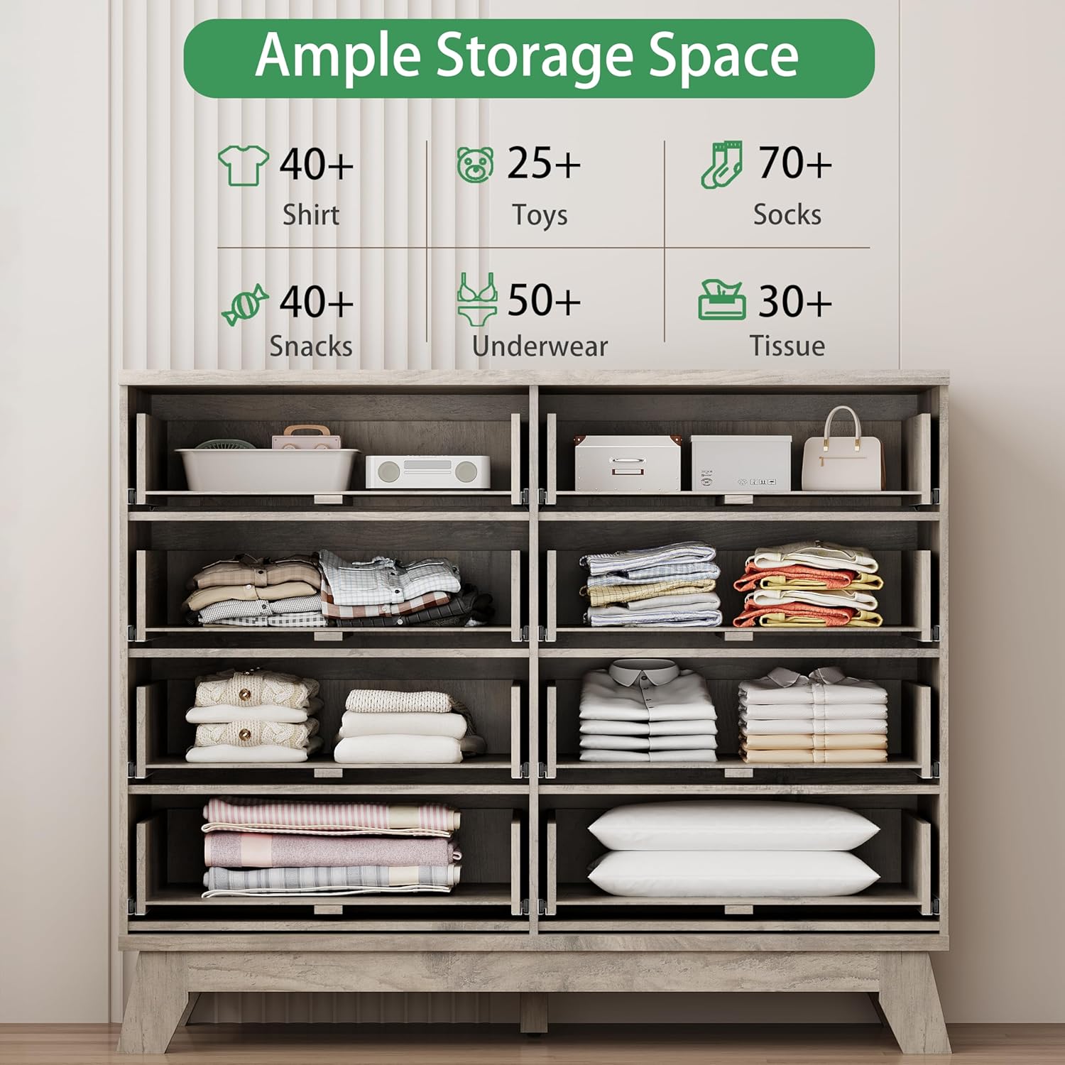 - ăLarge Storage CapacityăThe dresser for closet features 8 deep drawers that provide plenty of room for organizing clothing, bedding, cosmetics, or jewelry, helping you maintain a neat and tidy space. The wide wooden tabletop can serve as a dresser TV stand or display your decorations such as photo frames, plants or mirrors. Perfect for bedroom, living room, hallway, entryway