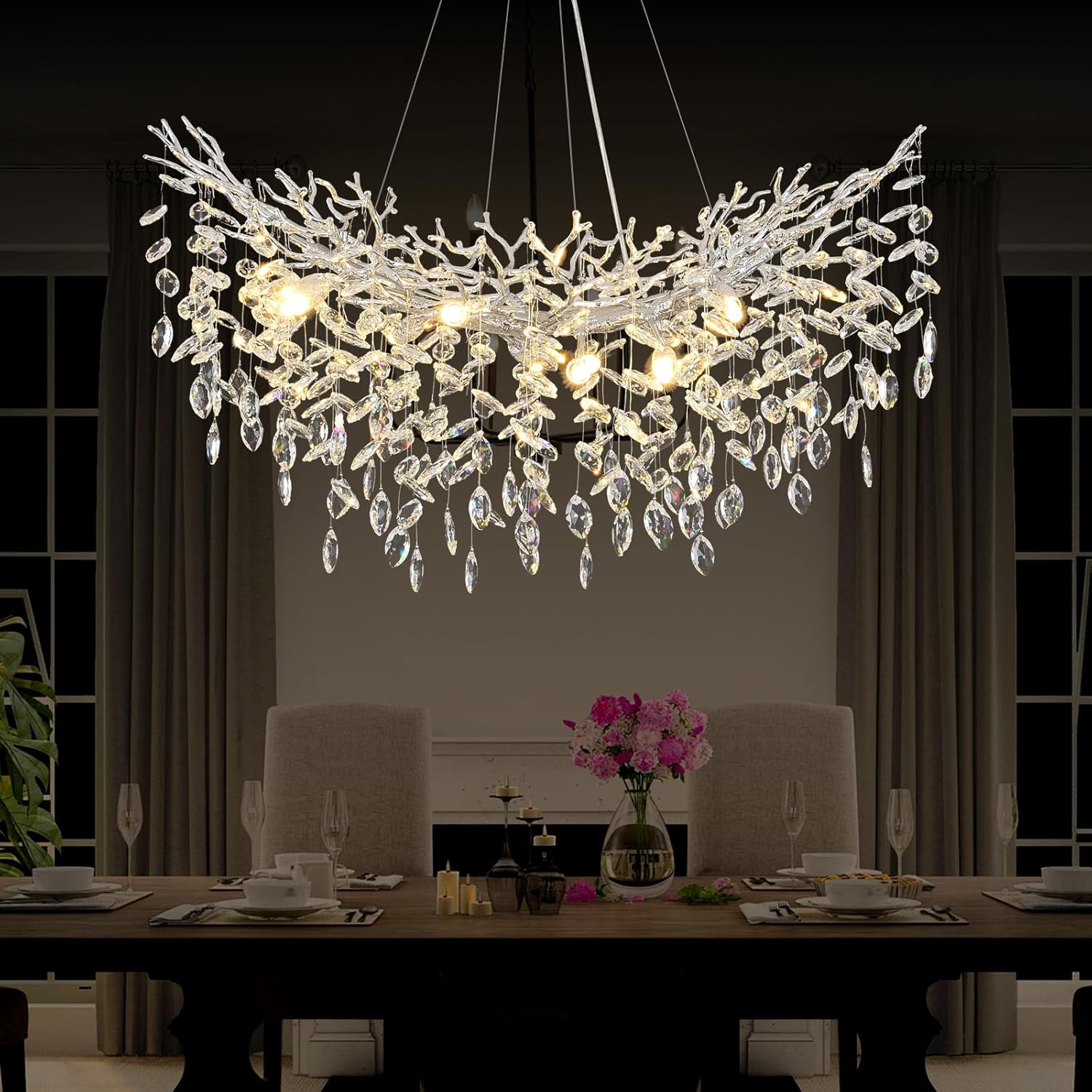 - Modern Crystal Chandelier:Transform your living space into a captivating masterpiece with our Elegant Crystal Tree Branches Chandelier. This stunning chandelier is designed to impress, featuring a unique tree branch-inspired design adorned with glistening crystals that cast a mesmerizing play of light and shadow.