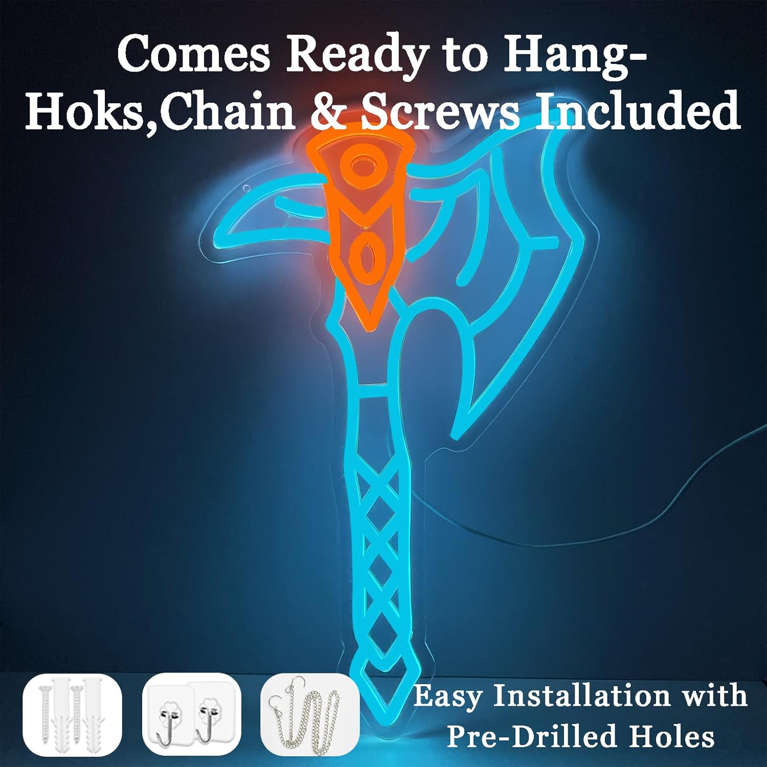 - MINUTES-TO-MOUNT: Pre-drilled holes with chain, hooks, and wall hardware make hanging straightforward; works as man cave decor led axe sign or a subtle room accent led axe sign above consoles, couches, or bar shelves