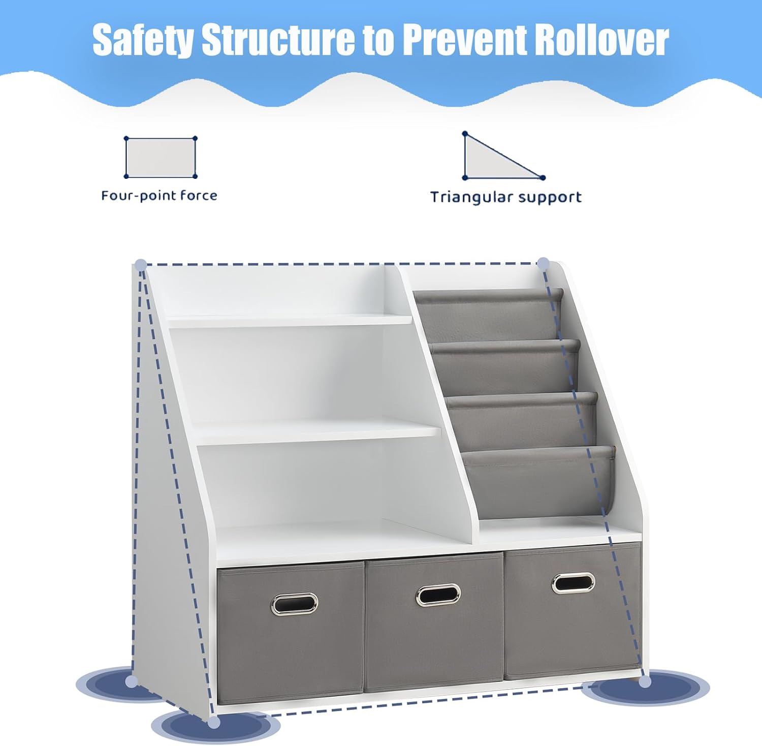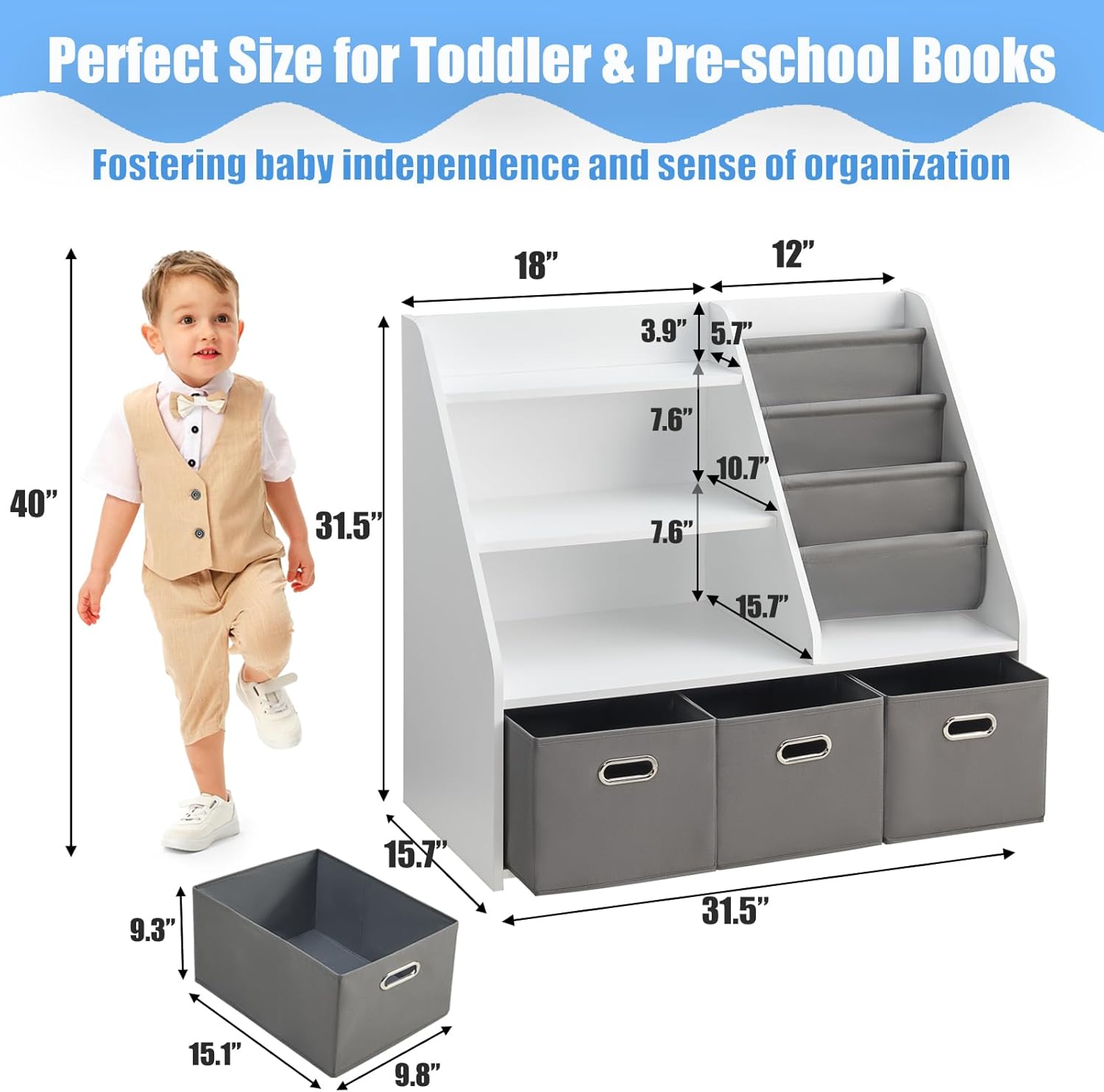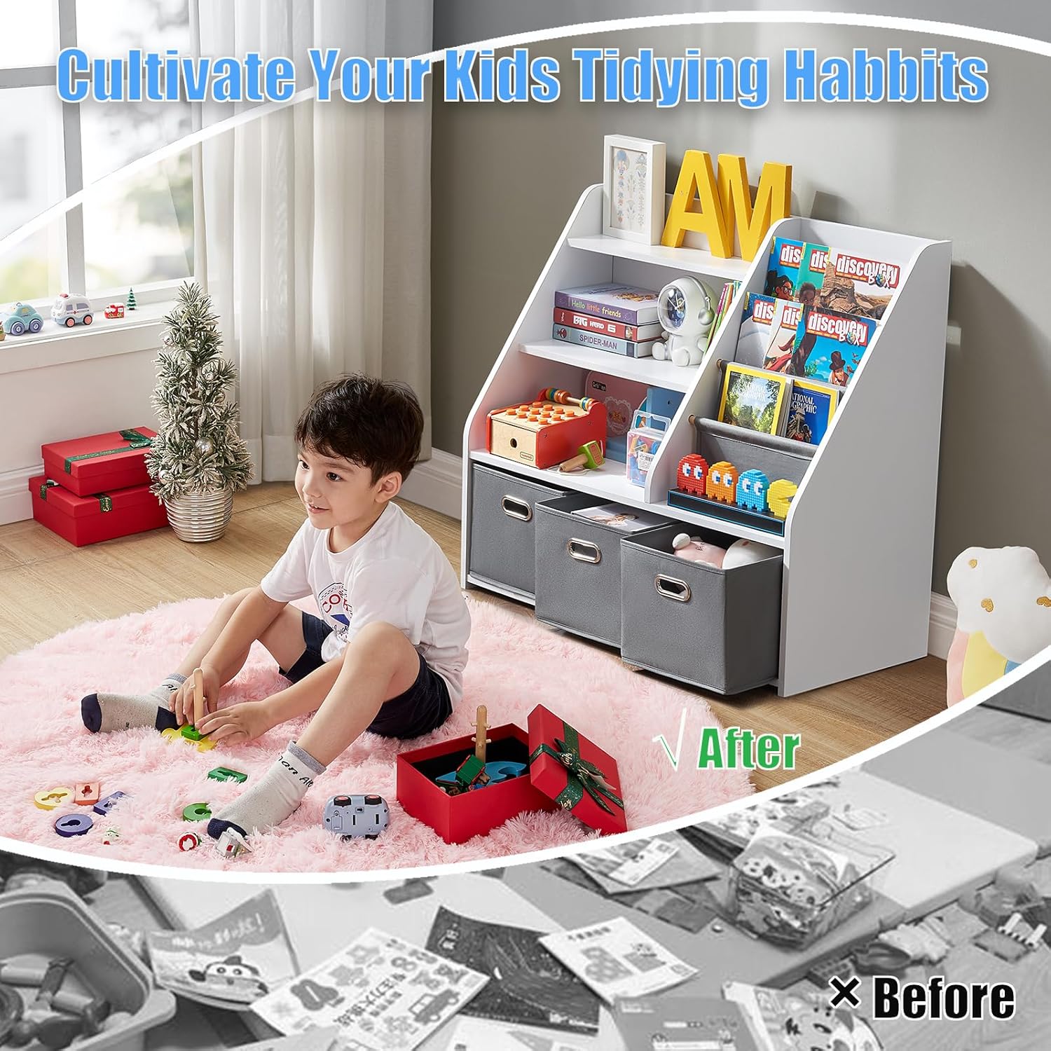 - ⭐️ [ All-in-One Storage Solution for Books & Toys] Features 3-tier fabric sling book rack, 3 open storage shelves, and 3 removable fabric bins — perfect for books, plush animals, blocks, dolls, art supplies, and more. Helps children develop good habits by making cleanup fun and simple.